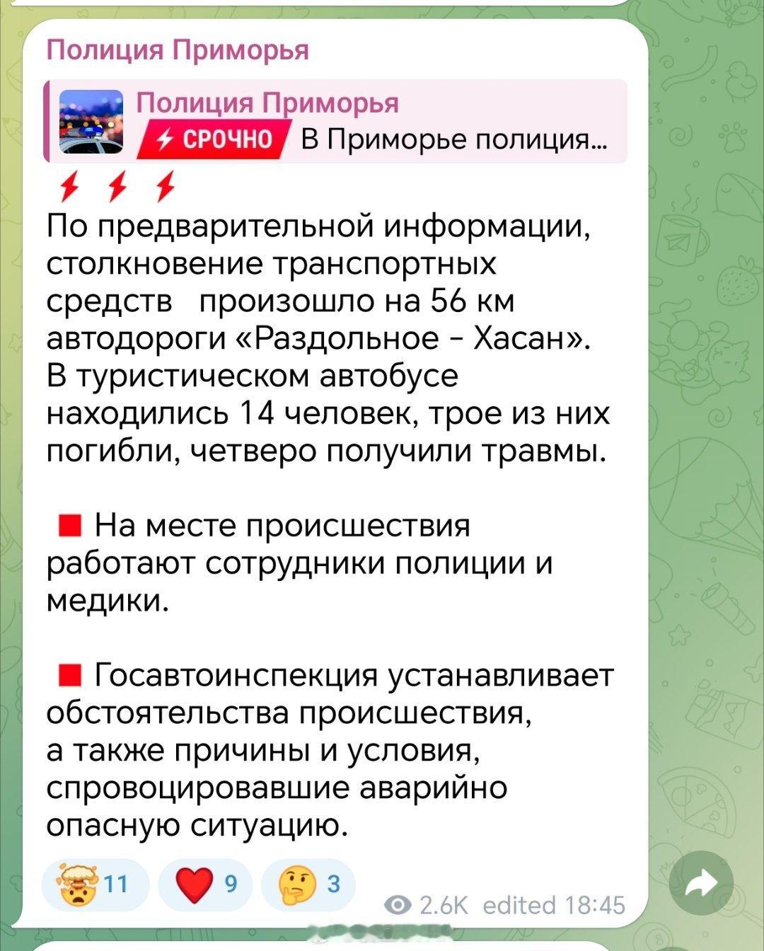 载有中国游客的旅游大巴在俄发生事故载有中国游客的旅游大巴在俄发生事故 据俄罗斯媒体报道,一辆载有中国游客的旅游大巴车在俄罗斯滨海边疆区拉兹多尔诺耶-哈桑公路56公里处与一辆卡车相撞。旅游巴士上有14人,其中3人死亡,4人受伤。
