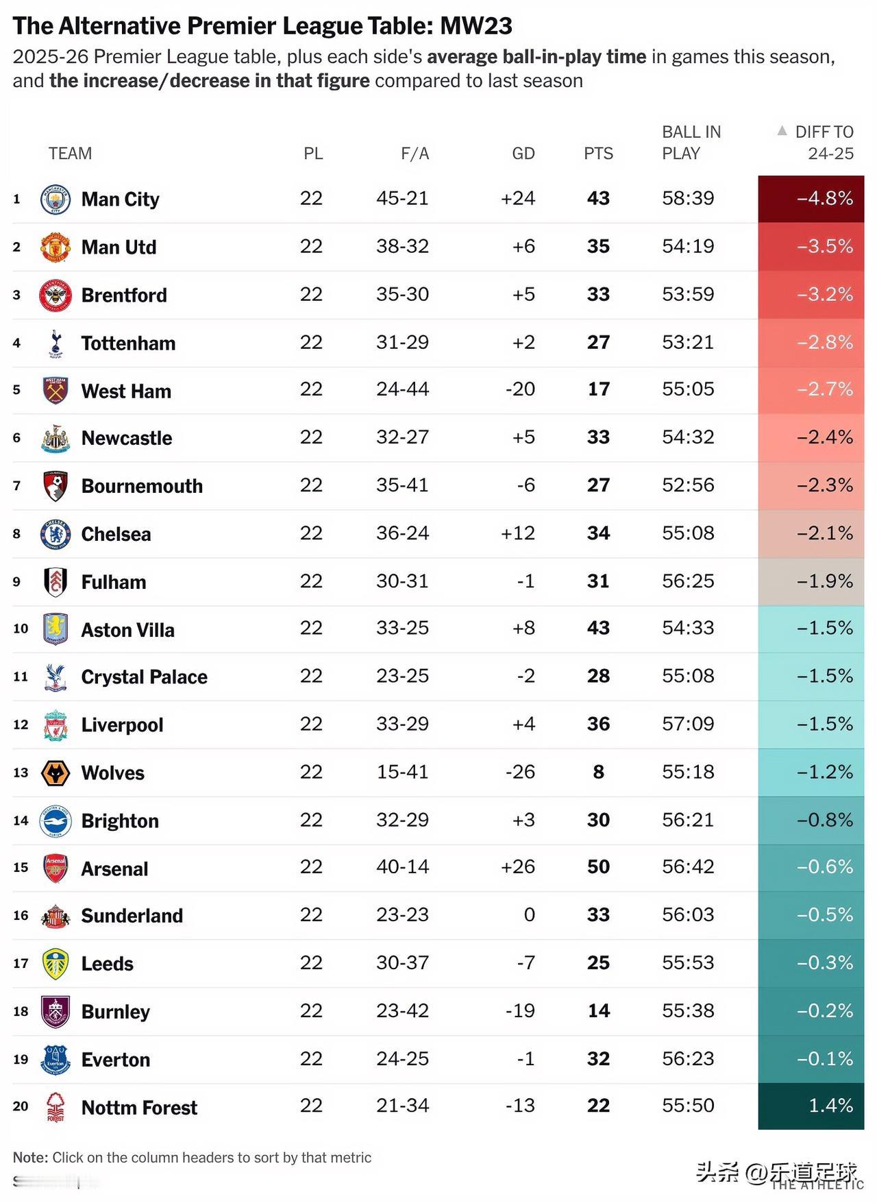 本赛季英超的有效比赛时间相比上赛季大幅减少,而与2024-25赛季相比,仅有一支球队的比赛有效时间有所增加。 伯恩茅斯和热刺的比赛有效时间最短;曼城的有效比赛时间最高,但正在快速下降,除诺丁汉森林外,其余19支球队场均控球时间均较上赛季减少(红色负增长)。 降幅Top3:曼城(-4.8%)、曼联(-3.5%)、布伦特福德(-3.2%);诺丁汉森林是唯一控球时间增加的球队(+1.4%)。