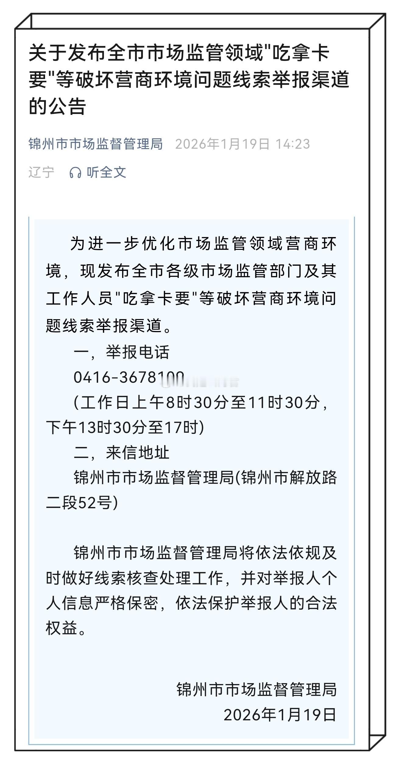 亿点曝光计划 锦州商家注意!市场监管“吃拿卡要”举报电话已公开!优化营商环境动真格,以后再遇到“吃拿卡要”的,别犹豫,直接一个电话送他“出道”。主打一个精准打击,让歪风邪气无处遁形!微博民生六大行集体发布公告 锦州·荣鹏风味烀饼总店(人民街总店)