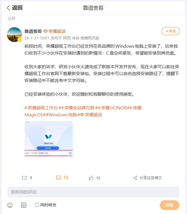 刚刚看到荣耀MagicOS产品总监靠谱贵哥,分享了一则图文,关于荣耀超级工作台小伙伴反馈能不能自定义安装路径,贵哥表示荣耀工程师非常听劝,新版本推送之后,大家就可以安装到其他盘符或者路径上了,我家电脑C盘划分还是较为理想,1T固态会划分300G作为系统盘,所以安装软件都默认C盘,大家平常是如何操作的呢?畅聊数码新品 数码资讯