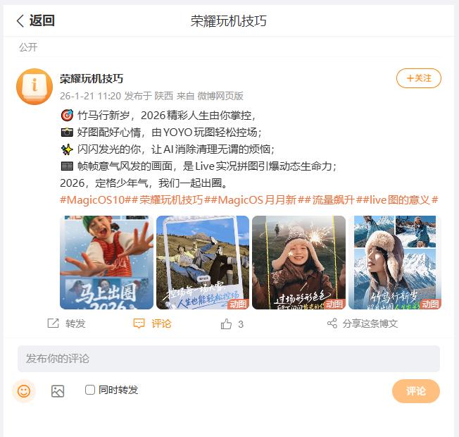 荣耀MagicOS 10发布以来,就为小伙伴们带来了蛮多的实用功能,刚刚看到荣耀玩机技巧推荐的几项颇有代表性的功能,在新的一年当中会带给大家蛮多的精彩。例如YOYO玩图的功能,可以通过AI来改变天气,这样的氛围感与众不同,一键处理满方便。 小伙伴们在拍摄完照片之后,如果画面中出现一些路人,或者是影响美观的痕迹,不妨试试荣耀AI消除,可以通过画圈等方式,一键消除美化,比自己P图更有效率。其实我更喜欢实况拼图的功能,而且破框而出的方式,还会带来裸眼3D的效果,Live图新玩法。 荣耀YOYO玩图、AI消除、实况拼图,小伙伴们在日常生活中,使用的机会多不多呢?现在只需关注 @超逸谈科技 并转发此微头条,2026年01月24日,将由 选出1位粉丝包邮送出暖暖杯55度礼品装,说不定下一个中奖的就是你哟!抽奖详情