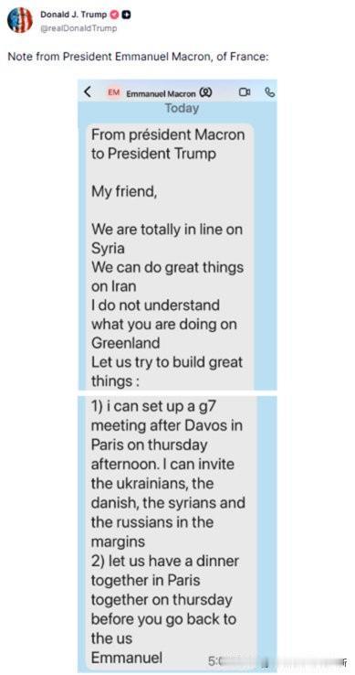 马克龙掏心掏肺递橄榄枝,称“朋友”、凑峰会、邀晚宴,盼着和美方共做“伟事”,转头就被特朗普把私信公之于众。一边是200%关税威胁,一边是“你快下台”的嘲讽,所谓盟友情谊不过是单边霸权下的自导自演,虚伪又滑稽! 怎么感觉特朗普跟东南亚某国有点像,那货公布的是录音!