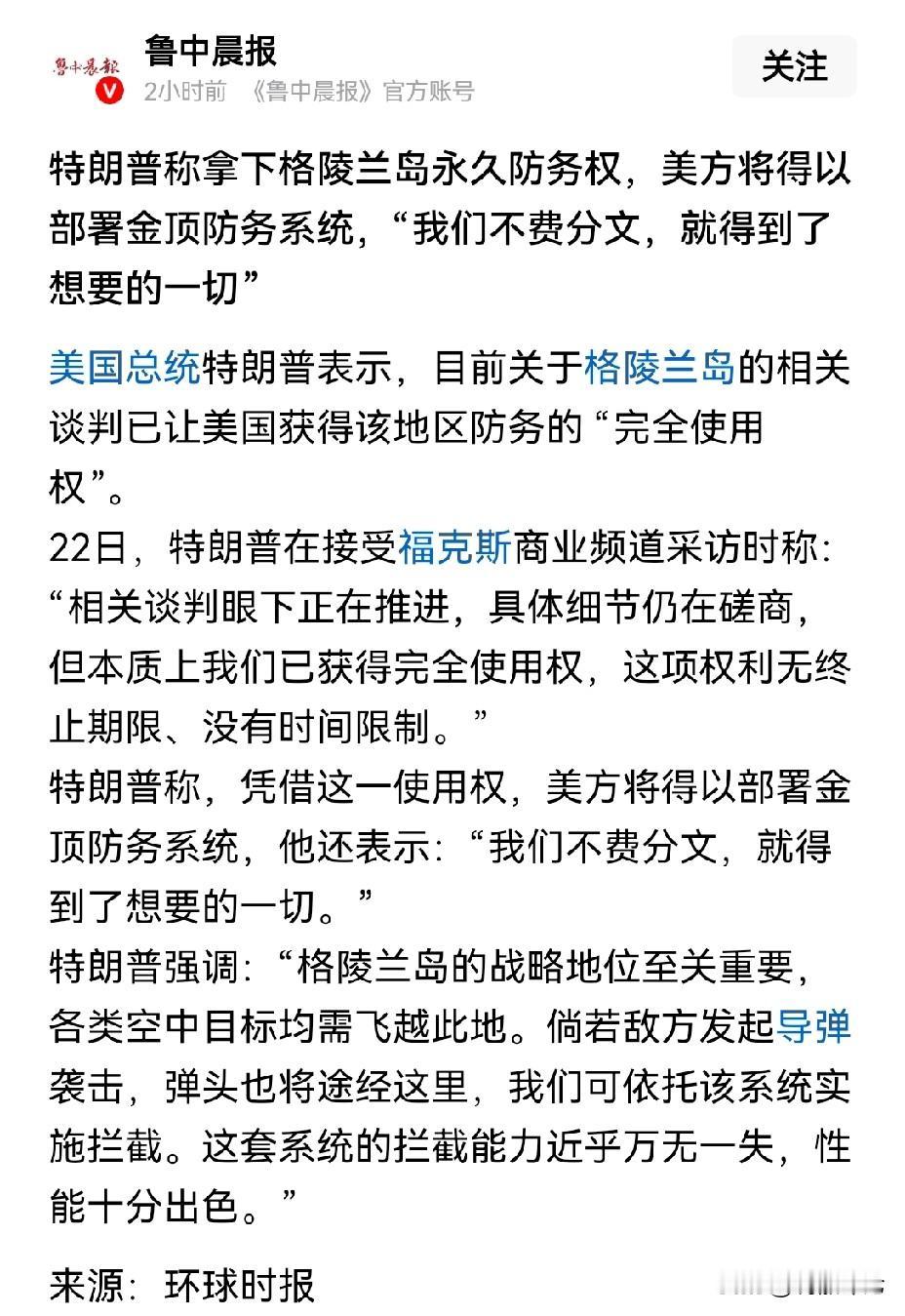 特朗普阴谋得逞:美国将全面接管格陵兰岛防务,这只是特朗普三部曲当中的第一步。接下来,特朗普的动作,必然是三部曲的第二步,第三步: 第二步,扩大在格陵兰岛的驻军,在该地区部署美国的金顶防御系统,以格陵兰岛为核心区,将进攻性武装力量扩张到整个北极圈。 第三步,获得格陵兰岛所有资源开采权,运营权,由此摘取格陵兰岛的稀缺资源,包括稀土资源。 这样的安排,确实符合欧洲自我安慰的心理,原来在欧洲,阿Q精神已经有了最新的现代化版本:既……又……还……