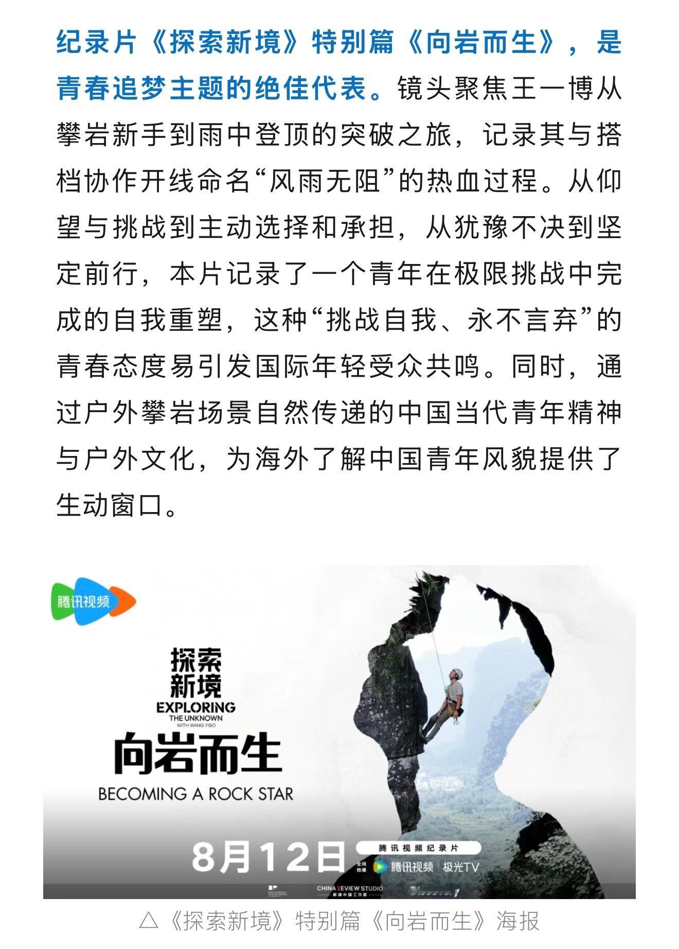 王一博 新时代新影像中外联合创作计划官方gzh发文:纪录片《探索新境》特别篇《向岩而生》,是青春追梦主题的绝佳代表。镜头聚焦王一博从攀岩新手到雨中登顶的突破之旅,记录其与搭档协作开线命名“风雨无阻”的热血过程。从仰望与挑战到主动选择和承担,从犹豫不决到坚定前行,本片记录了一个青年在极限挑战中完成的自我重塑,这种“挑战自我、永不言弃”的青春态度易引发国际年轻受众共鸣。同时,通过户外攀岩场景自然传递的中国当代青年精神与户外文化,为海外了解中国青年风貌提供了生动窗口。