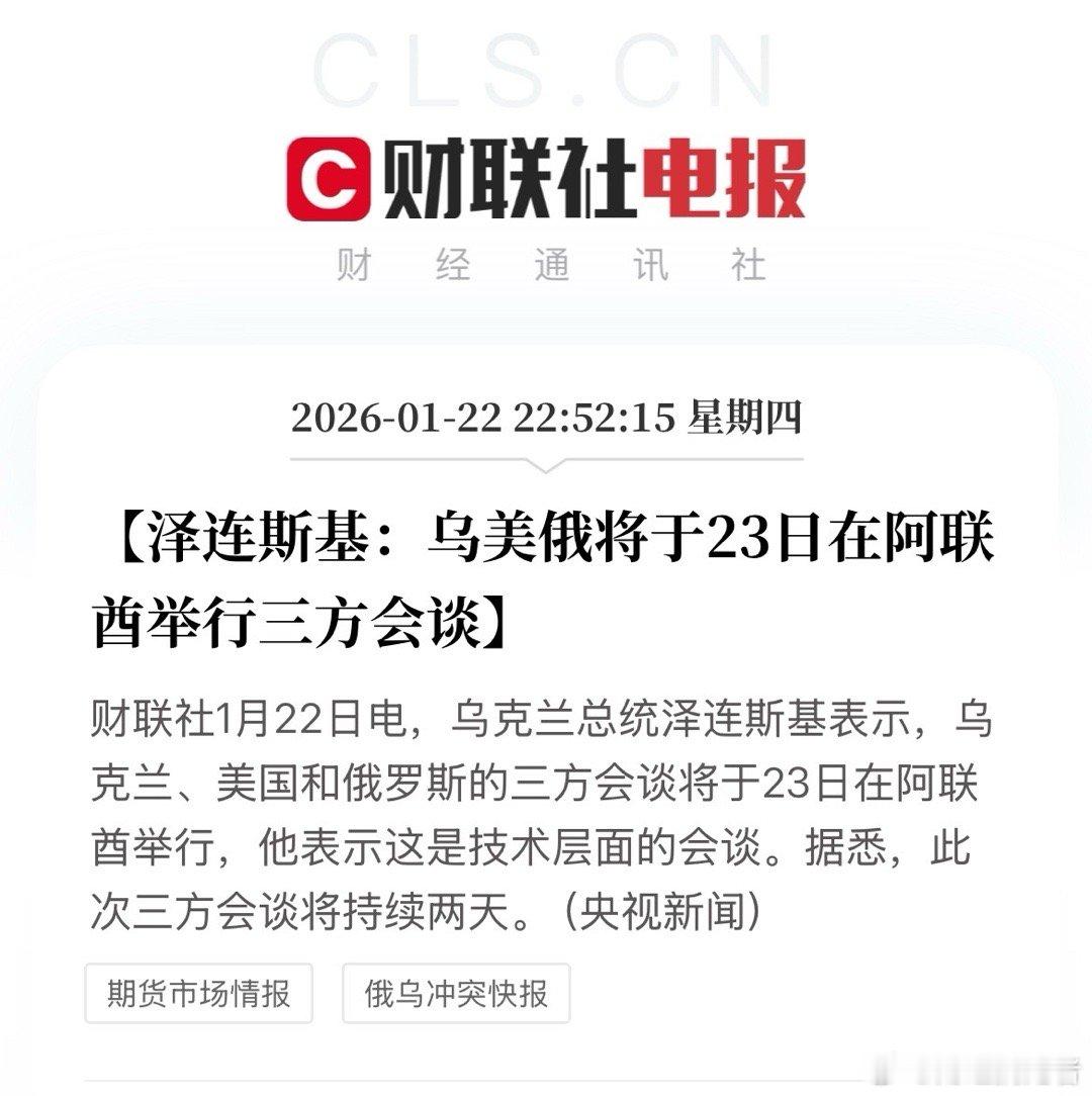 【泽连斯基:乌美俄将于23日在阿联酋举行三方会谈】1月22日,泽连斯基在达沃斯世界经济论坛上宣布,乌美俄三方技术层面会谈将于1月23日至24日在阿联酋举行,为期两天,这也是三方首次在阿联酋开展此类会谈。泽连斯基直言,希望俄罗斯能为此次会谈做好妥协准备,并称推动对话总比毫无沟通更有意义。此次会谈落地前,外交斡旋已密集展开。泽连斯基当日刚与特朗普举行会谈,双方评价会面“富有成效”,乌方还提及将继续推动乌克兰防空能力建设;而美方特使威特科夫、库什纳已于22日晚赴莫斯科与普京会面,威特科夫此前曾透露,俄乌和谈目前“只剩一个问题待解决”,且会谈将涉及乌克兰“土地交易”议题,相关和平协议文件也已接近拟定完成。值得关注的是,当前俄乌冲突仍存核心分歧,俄方坚持要求乌克兰承认克里米亚及乌东相关地区的现状,乌方则坚决拒绝法理上的领土割让,同时寻求美国长期且具有约束力的安全保障,美俄乌三方的利益博弈仍在持续。此次阿联酋的技术层会谈,成为多方试探彼此立场的关键一步,也为后续和平谈判铺垫基础,但其能否推动冲突破局,仍取决于各方能否在核心议题上达成共识。