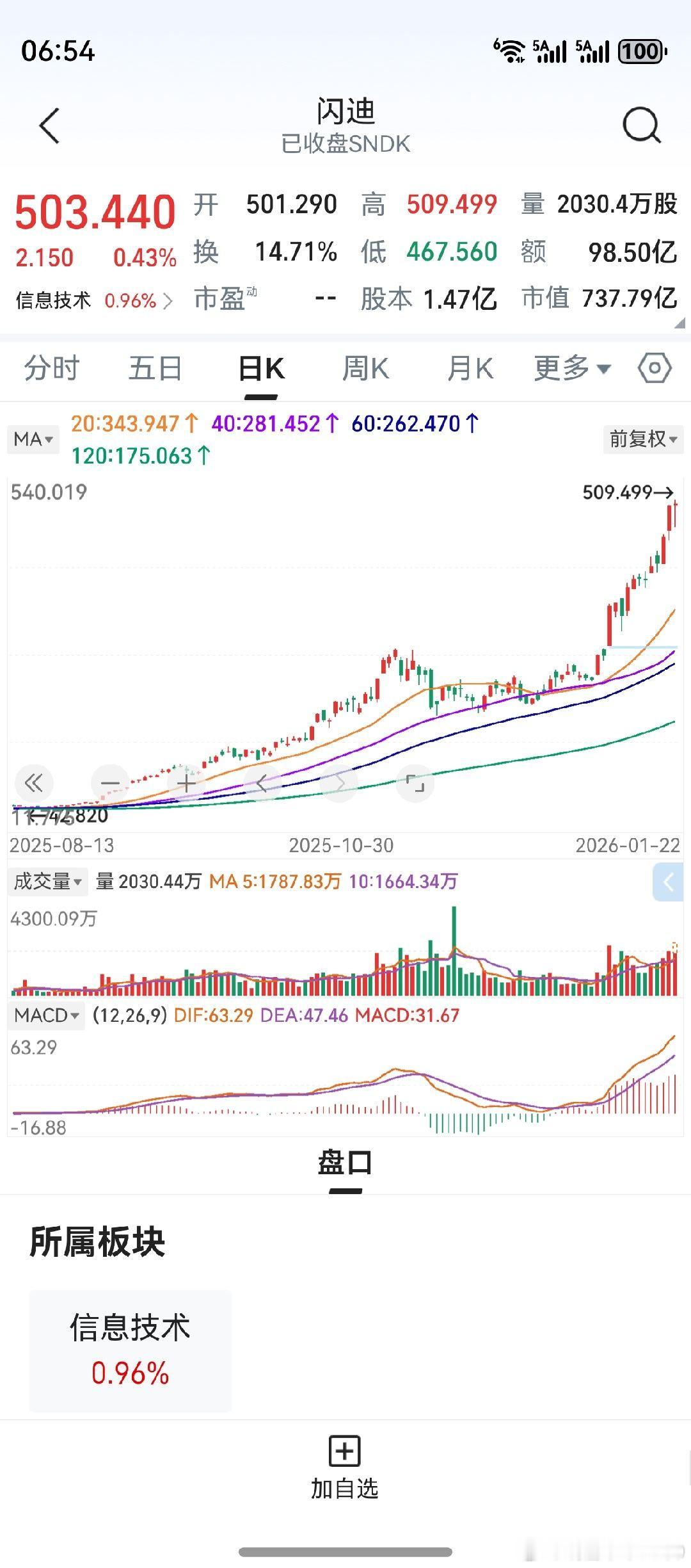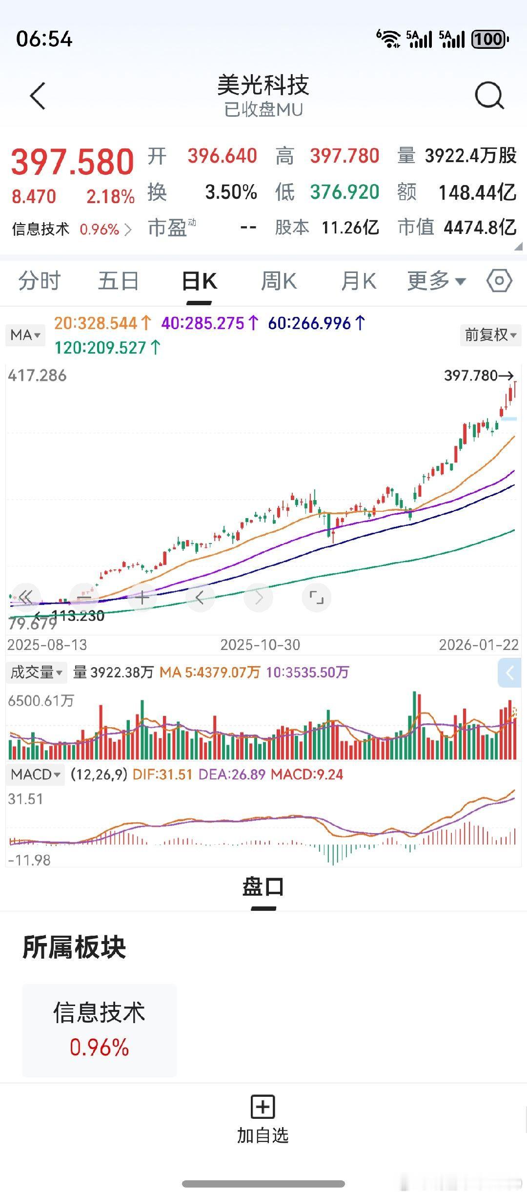 隔夜美股上涨,暂时稳住了阵脚。美光科技,闪迪,再刷新高。这两幅图,大家不妨关注一下均线排列。看看视觉效果,是否极具美感?三线平行比天高,个人技术口诀巅峰。