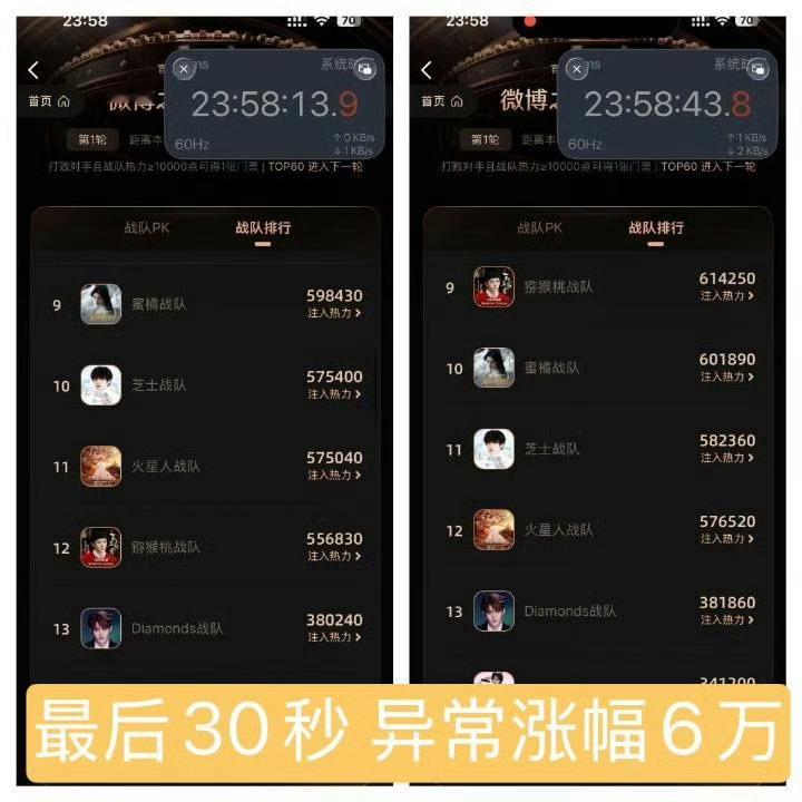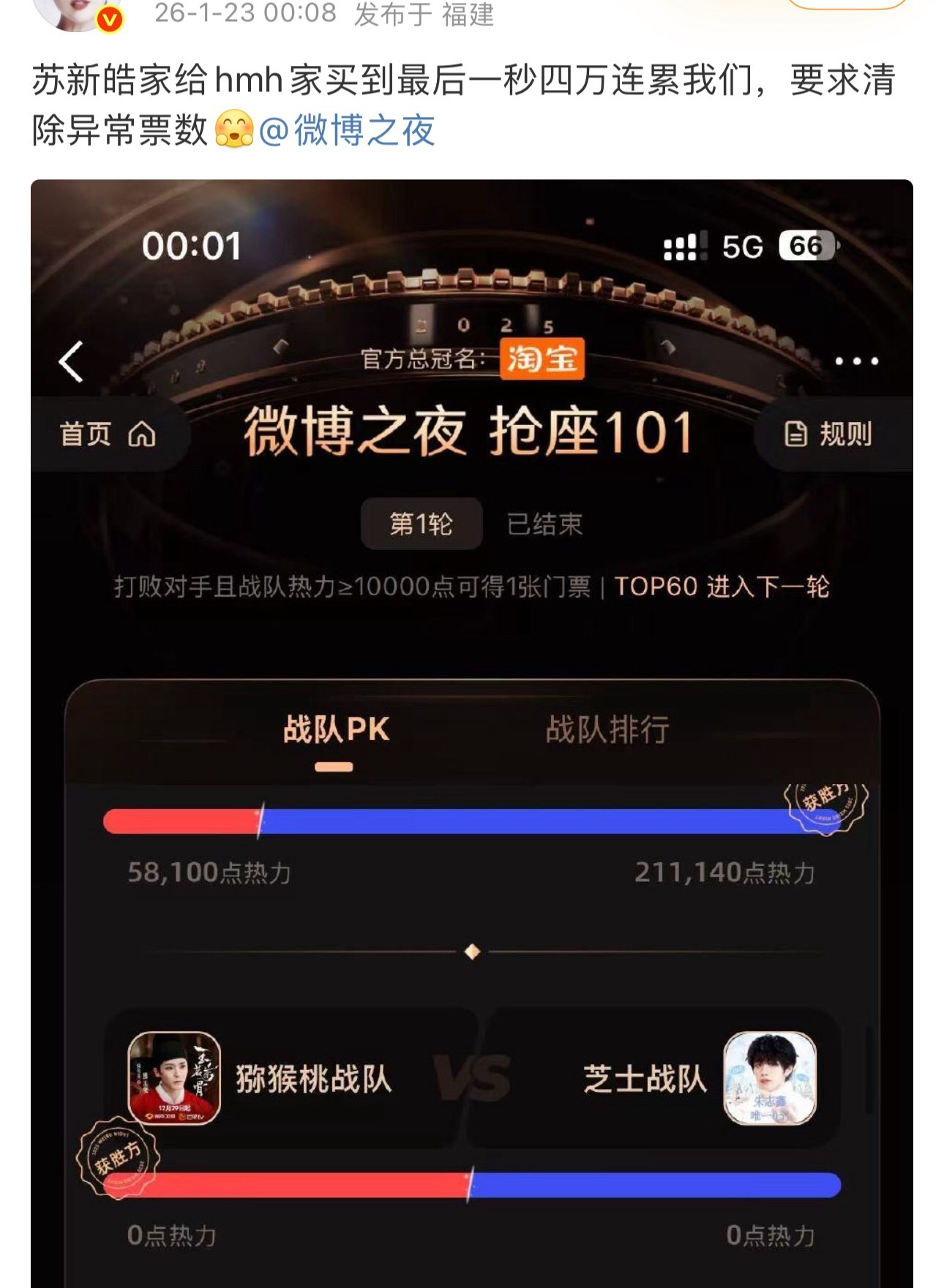 昨天朱志鑫粉丝战队pk侯明昊粉丝战队,在最后一分钟的时候侯明昊粉丝那边涨幅近6万,朱志鑫粉丝质疑是苏新皓粉丝弄的微博之夜