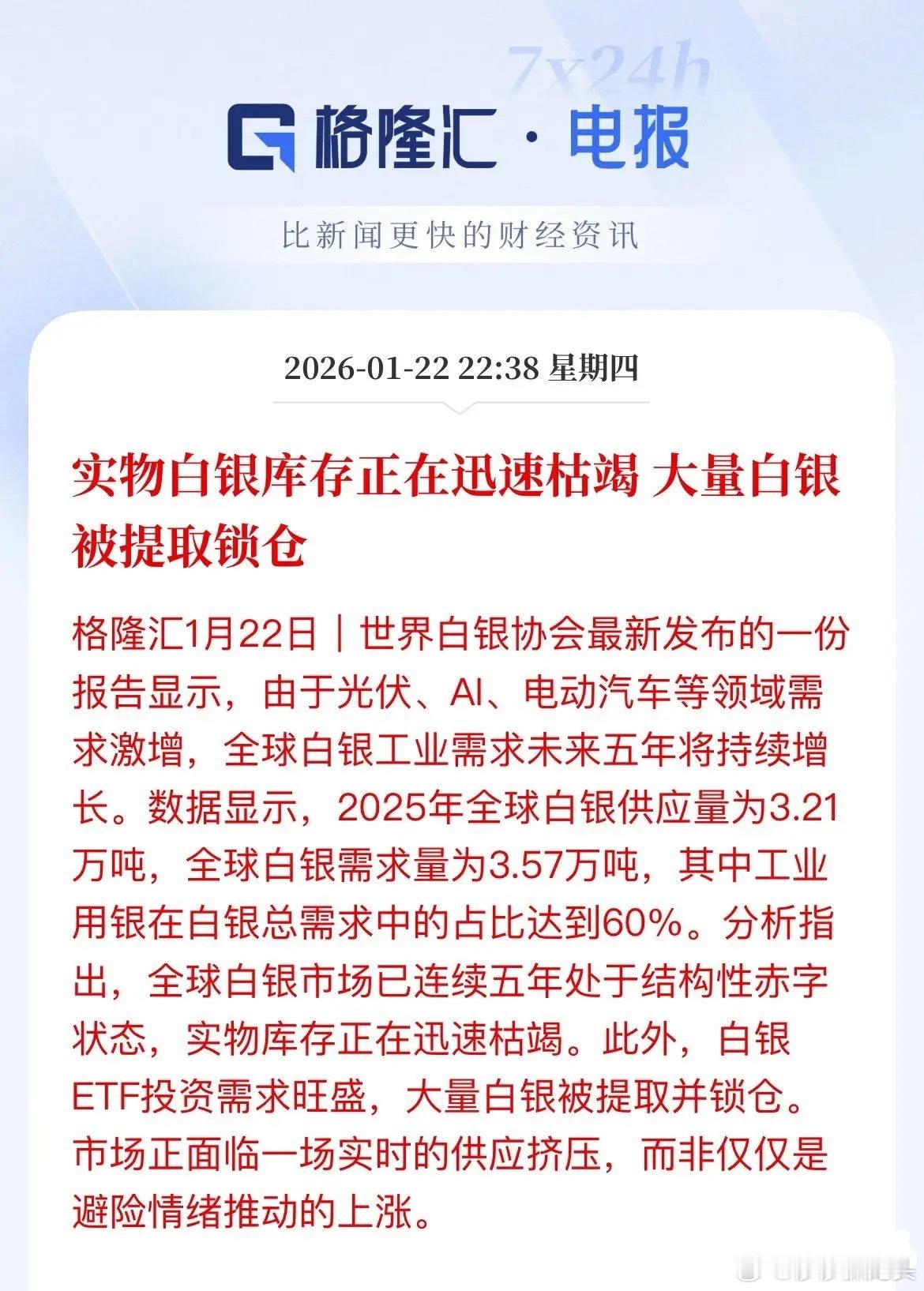 白银危机!全球库存告急,这些A股公司将受益!世界白银协会发布最新报告显示:由于光伏、AI、电动汽车等领域需求激增,全球实物库存急速下降,供应危机已至!报告揭示了惊人数据:全球白银市场已连续5年“入不敷出”,2025年供应缺口进一步加剧。更关键的是,工业需求已占据总需求的60%,光伏面板、AI服务器、汽车电子都在疯狂“吞银”。与此同时,机构投资者大量提取ETF实物白银进行锁仓,现货市场正在上演真实挤压行情。也就是说,当金融属性与工业需求形成“双击”,白银的上涨可能不再是昙花一现。历史告诉我们,实物短缺往往催生历史行情。核心受益方向梳理:1. 白银开采与冶炼企业白银价格上涨将提升相关公司的盈利能力和资源价值。· 盛达资源:国内白银龙头企业,白银储量及产量居A股前列。· 兴业矿业:拥有银矿资源,白银业务占比较高。· 国城矿业:涉及银、铅锌等有色金属开采。· 银泰黄金:黄金为主,但白银业务也有一定占比。· 湖南白银:白银全产业链布局,冶炼产能领先。2. 多金属矿业公司白银常作为铜、铅、锌等金属的伴生矿产出,价格上涨将提升综合收益。· 江西铜业:铜冶炼副产品包含白银。· 紫金矿业:铜、金产量大,白银作为副产品。· 中金黄金:黄金开采中含白银副产品。· 西部矿业:铅锌矿伴生白银。3.光伏用银相关公司光伏银浆作为光伏电池的必需材料,头部企业凭借技术壁垒和客户粘性,能够通过价格传导消化白银涨价压力,并在此过程中巩固市场地位。· 帝科股份:光伏银浆龙头企业。· 苏州固锝:子公司晶银新材主营光伏银浆。· 聚和材料:光伏银浆供应商。· 浩通科技:贵金属回收专家,打造“城市矿山”。4.工业用银替代或技术升级公司若白银价格持续上涨,或将推动替代材料或技术升级需求。· 中矿资源:涉及稀有金属,可能受益于材料替代趋势。· 博威合金:高性能合金材料,可能涉及白银替代方案。但同时也需注意:1. 白银价格波动较大,需注意风险控制。2. 光伏领域已开始研发银浆替代技术,长期需关注技术变革。3. 伴生白银企业的业绩弹性取决于主产品价格联动。