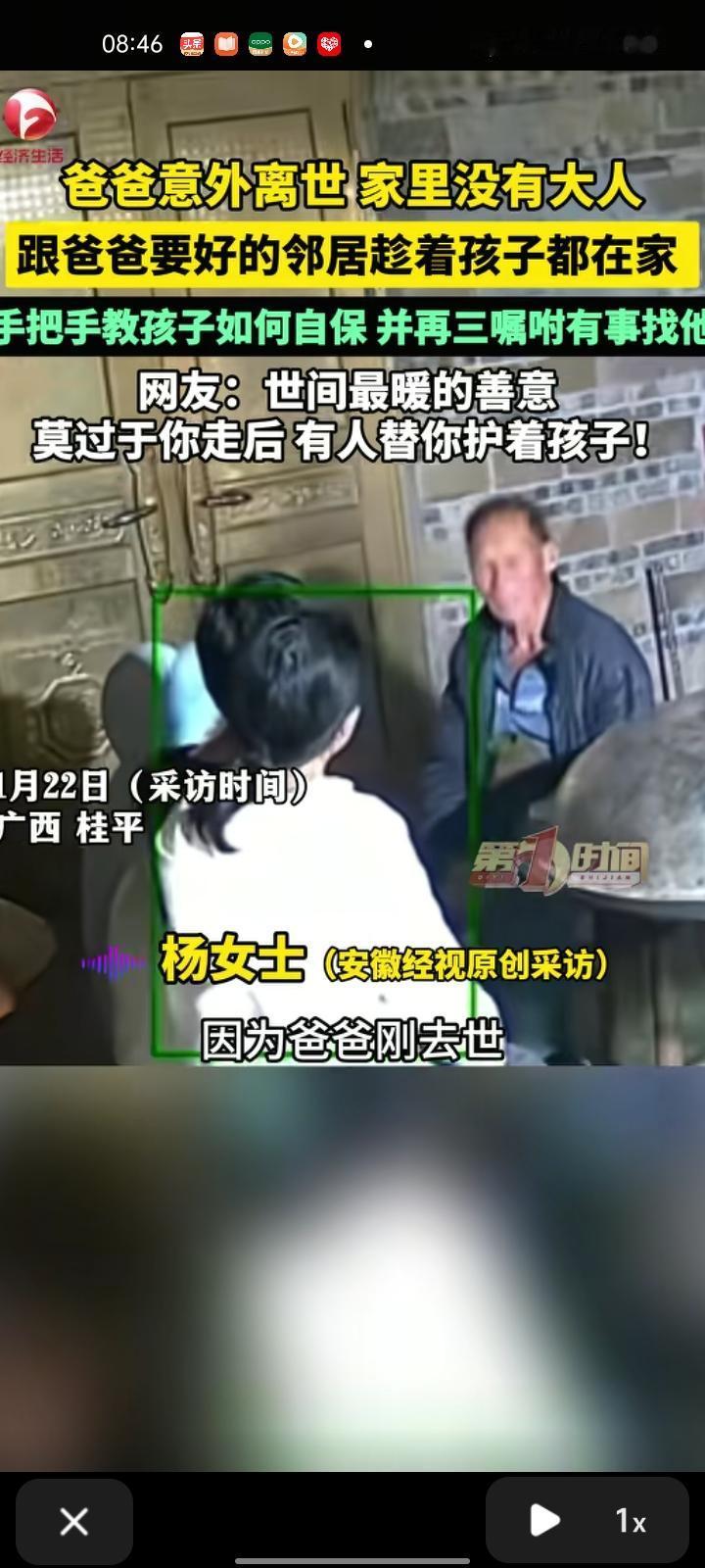 1月18日,贵港桂平市。网友晒出一段监控视频,爸爸意外离世,家里弟弟妹妹没有大人,和爸爸要好的邻居趁着孩子在家,手把手嘱咐孩子如何自保,并再三嘱咐有事找他,看了这一幕让人感动。 邻里无血缘,相助见真情。一句叮咛重千钧,一份照拂暖人心,平凡邻居的仗义之举,为猝然失怙的孩子们撑起了临时的伞,这便是人间最朴素的善意与担当。