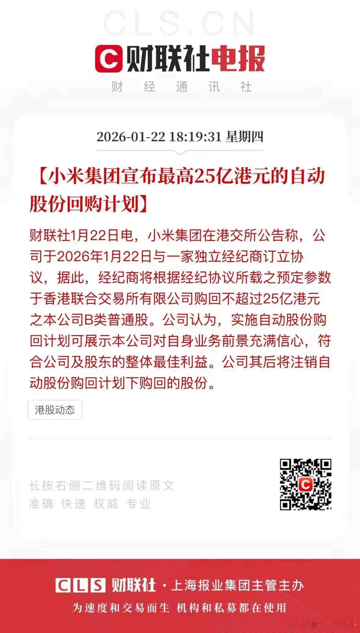 这下放心了吧,小米公司将注销自动股份购回计划下购回的股份。