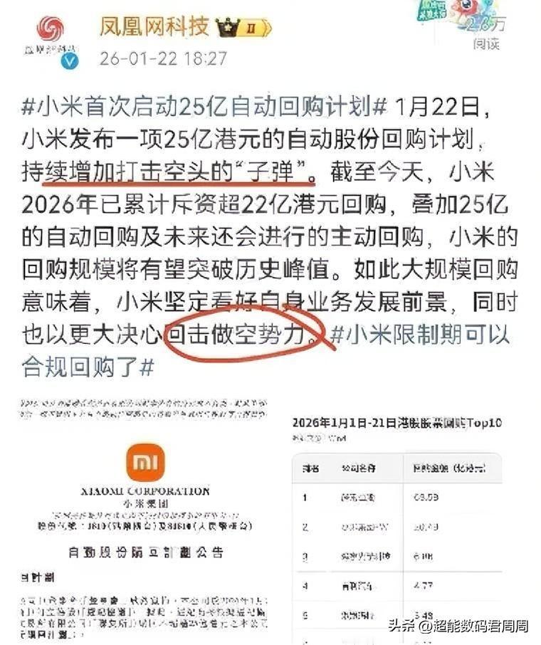 根据凤凰网的报道,米将首次启动25亿自动回购计划!旨在持续滑加打击空头的“子弹”。截至目前米在2026开年已斥资超22亿满元回购,如果算上这笔25亿回购,那么米的自主回购规模确实挺大,业界多位人士表示他们坚定看到米在未来的发展前景,同时也表示会用更大决心来击败做空群体。虽然我不怎么玩这个,但业界人士说的话我个人持主观疑问,他们说有人在做空,请问是哪些人呢?目前的情况核心问题是市场信心问题,为何总是聚焦做空呢?[笑哭] 注:股市有风险,投资需谨慎!