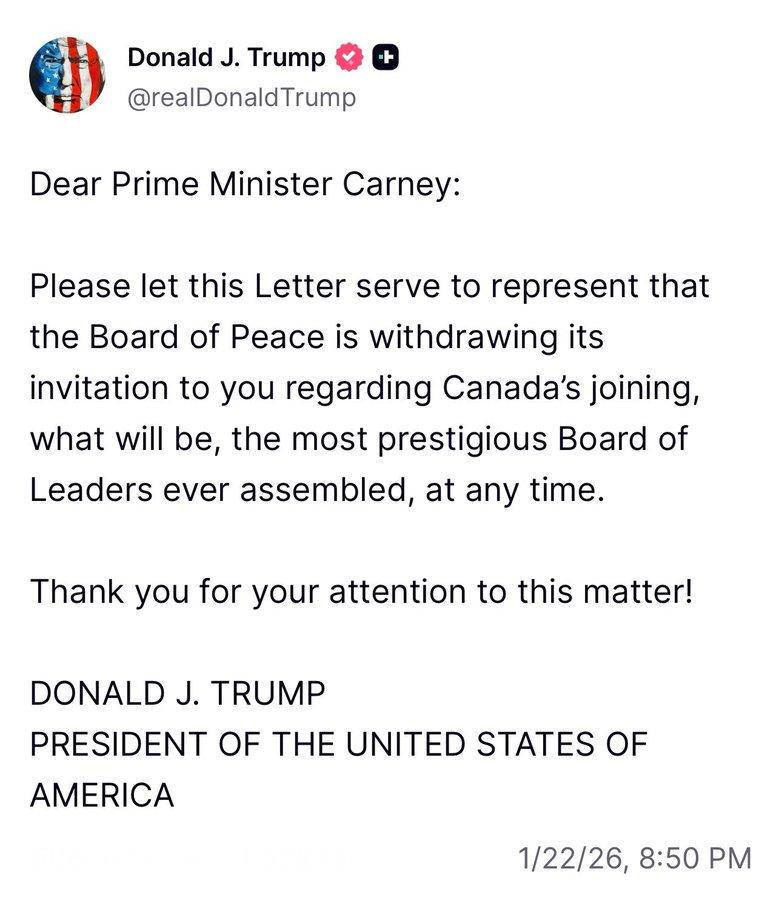 加拿大总理卡尼在达沃斯公开反抗美国, 惹得特朗普不高兴了! 宣布撤回“和平委员会”对加拿大的邀请。 还写了一封信,发表在社交媒体上, 信件内容如下: 尊敬的卡尼总理: 请允许这封信作为通知,和平委员会决定撤回对您关于加拿大加入的邀请,而这一委员会将成为有史以来最具声望的领导人委员会。 感谢您对此事的关注! 唐纳德·J·特朗普 美利坚合众国总统