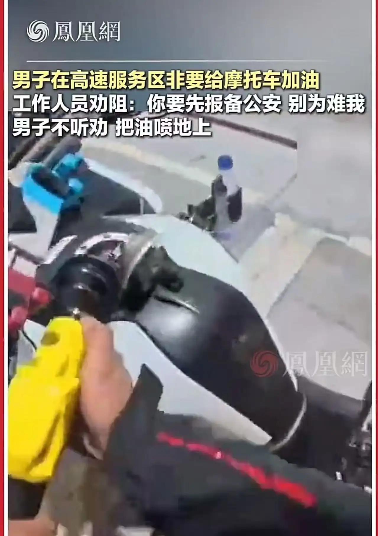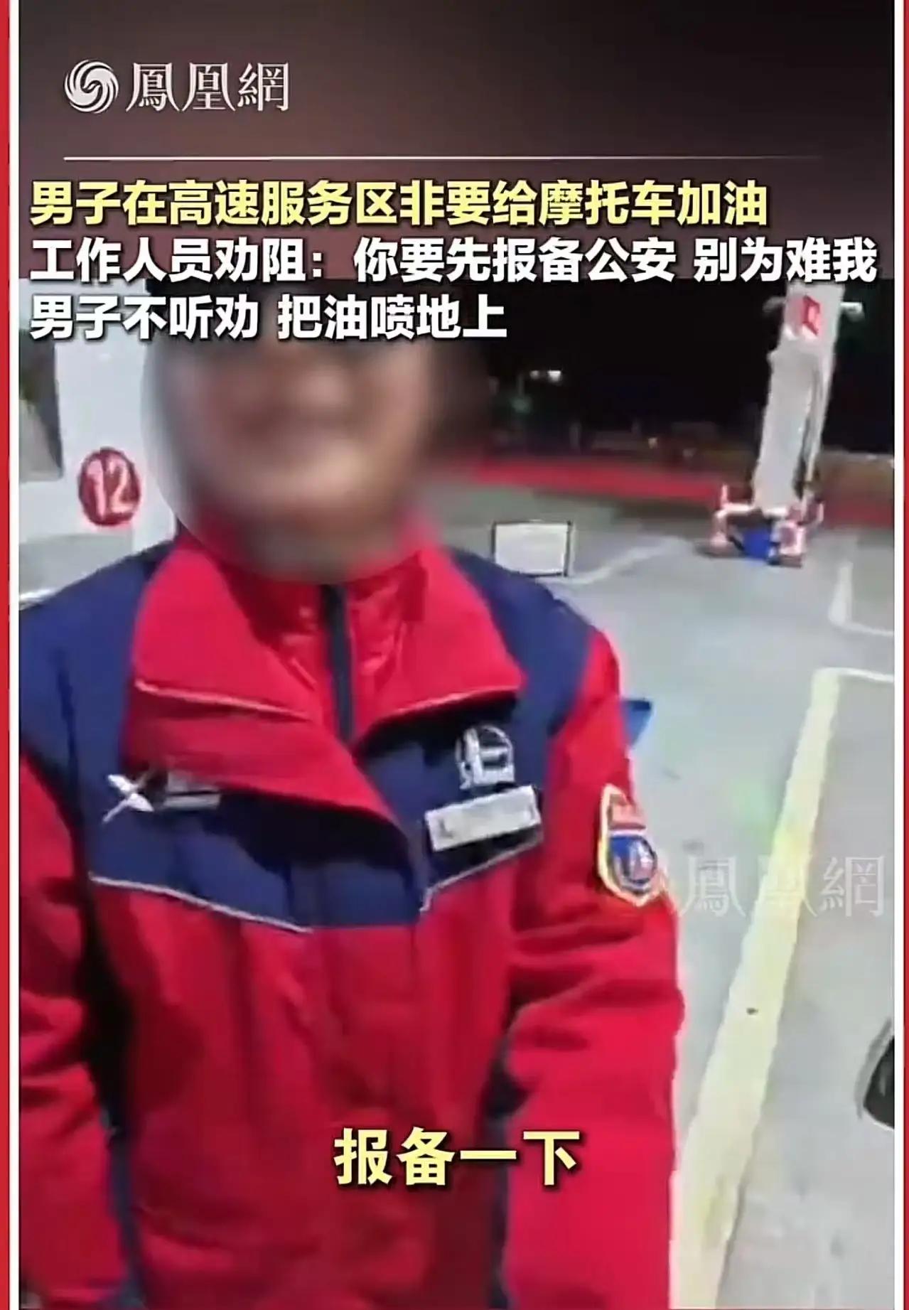 高速服务区这男的太败类!要求给摩托车加油遭劝阻,得知需先报备公安后,竟直接把油喷地上撒气,还为难当班的女加油员。规矩又不是小姑娘定的,有脾气冲制定规则的人去,欺负基层工作人员算什么爷们?高速服务区趣闻 高速上摩托车 高速服务区乱象 素材取于网络,侵权删除。