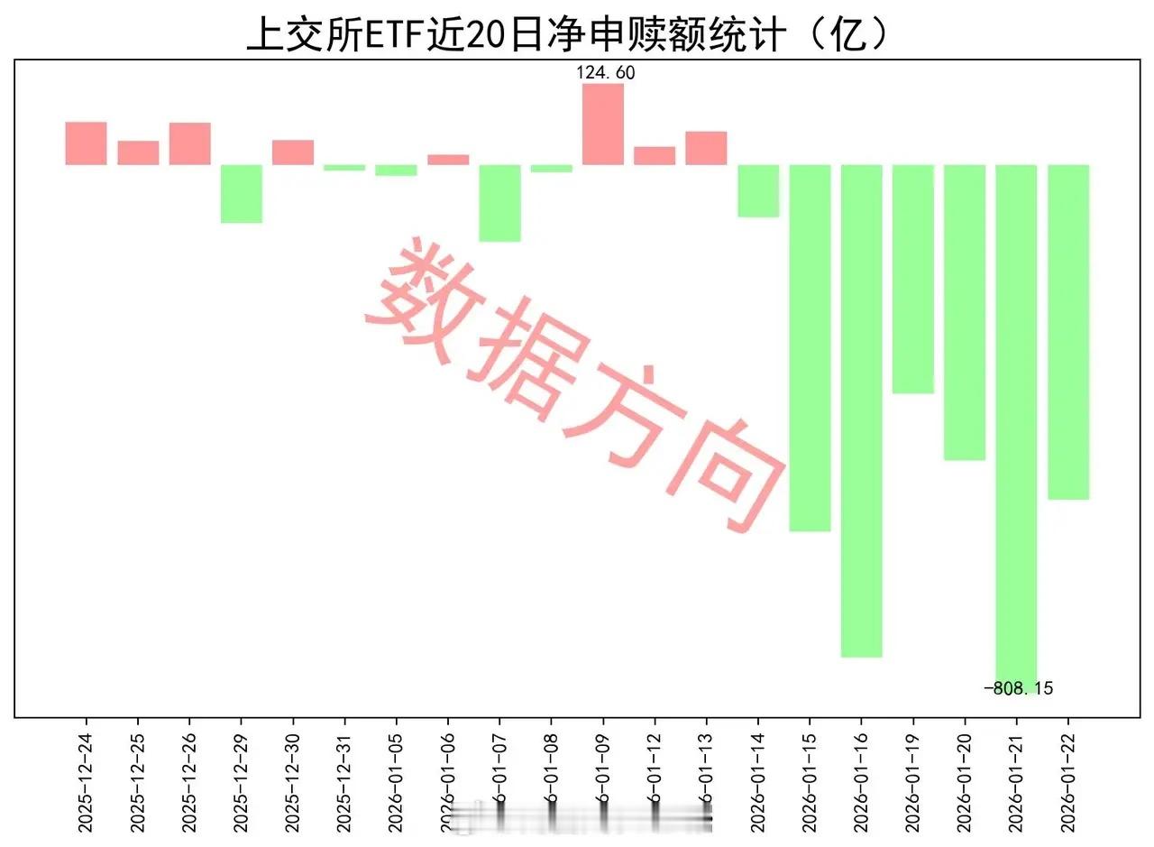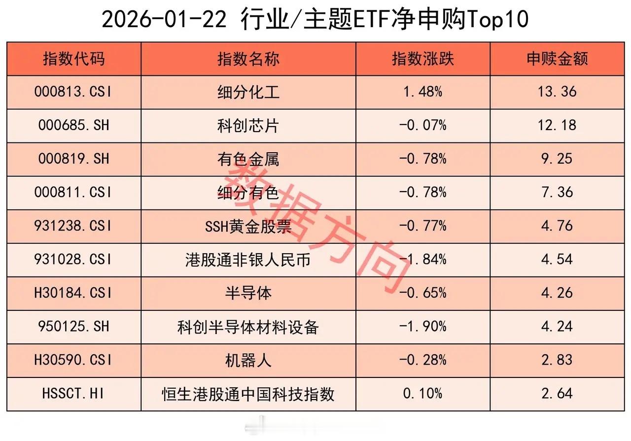 毫不手软,大卖3400亿1月22日星期四,大盘震荡后收阳,商业航天、建材、油气涨幅居前。上证指数涨幅0.14%,上交所ETF合计净赎回511.87亿元。1层态度坚决,这是其连续第6天大幅净赎回,6天以来累计净赎回3435.69亿,在过去,很多时候一年也申购不了这么多。好在市场交投活跃,仍然保持了2.7万亿的日成交额,指数的权重股暂时不好去,资金转而流入一些小盘股,于是带来一些结构性机会。这种成交额不知道还能保持多久,一旦难以为继,可能就真的要调整了。宽指仅有科创创业50指数(0.05亿)、中证A50指数(0.05亿),获小幅净申购,几乎可以忽略不计。沪深300指数(-404.78亿),净赎回超过400亿。中证1000指数(-97.38亿)、上证50指数(-52.24亿),净赎回都在50亿之上。中证A500指数(-16.86亿)、科创50指数(-9.14亿)、科创100指数(-5.0亿),净赎回都在5亿之上。中证500指数(-1.5亿)、上证180指数(-0.21亿)、上证指数(-0.18亿),分别被小幅净赎回。行业和主题 细分化工指数(13.36亿)、有色金属指数(9.25亿)、细分有色指数(7.36亿)、SSH黄金股票指数(4.76亿),一起进入申购榜。科创芯片指数(12.18亿)、半导体指数(4.26亿)、科创半导体材料设备指数(4.24亿),一起进入申购榜。港股通非银人民币指数(4.54亿)进入申购榜;证券公司指数(-3.1亿)、300非银指数(-0.78亿),一起进入赎回榜。其他进入申购榜的还有:机器人指数(2.83亿)、恒生港股通中国科技指数(2.64亿)。中证新能指数(-1.15亿)、光伏产业指数(-0.88亿),一起进入赎回榜。CS人工智指数(-1.14亿)、科创AI指数(-1.09亿)、人工智能指数(-1.0亿),一起进入赎回榜。其他进入赎回榜的还有:中证红利指数(-1.04亿)、中证军工指数(-1.03亿)、中证煤炭指数(-0.99亿)。