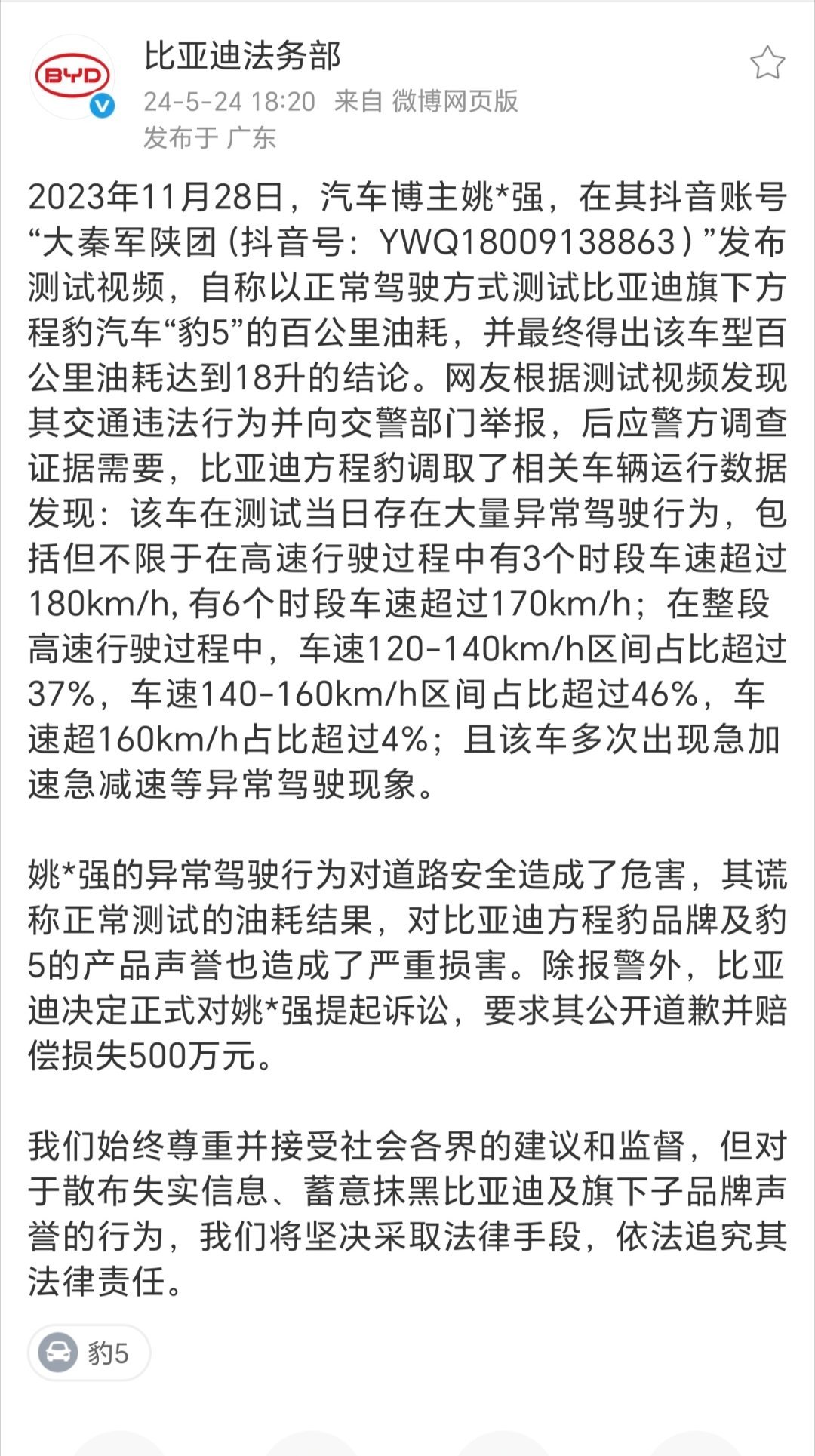 【“姚十八”侵权比亚迪方程豹案判决,支付赔偿款等共计 201 万元】 近期,就比亚迪起诉姚*强(抖音账号“大秦军陕团”)一案,比亚迪法务部公告案件胜诉。1 月 22 日比亚迪法务部发布公告披露,法院判决认定被告编造并传播了方程豹汽车的虚假信息,损害了比亚迪及方程豹品牌的商业信誉及商品声誉,构成商业诋毁。判令被告姚*强向比亚迪公司赔偿201万元。随后,比亚迪集团品牌及公关处总经理李云飞转发该公告并表示:“一直以来,我们都是黑公关黑水军的最大受害者!我们接受媒体的批评和监督,但对于编造虚假信息、恶意造谣、诋毁攻击的黑公关和黑媒体,我们绝不容忍,一追到底,绝不姑息!”  抵制黑公关还网络一片净土,此前在公开活动中,李云飞也曾明确立场:“比亚迪到了现在的位置和体量,如果有媒体就客观事实进行报道批评,都没问题!有些媒体不了解情况,有些误解性的发布,我们也能接受!但对于黑公关、黑媒体,为了黑而黑,长期针对比亚迪,诋毁比亚迪,我们绝不容忍!” 2023 年 12 月,方程豹豹 5 上市之际,姚*强通过抖音账号“大秦军陕团”发布视频,声称以正常驾驶方式测试方程豹旗下车型豹5,得出百公里油耗18升的结论,在网络上引起了大范围的关注及讨论。之后应警方调查取证需要,比亚迪调取数据显示:测试当日车辆存在大量异常驾驶行为,高速行驶过程中有3个时段车速超过180km/h, 有6个时段车速超过170km/h,在整段高速行驶过程中,车速120-140km/h区间占比超过37%,车速140-160km/h区间占比超过46%,车速超160km/h占比超过4%。 有细心的网友发现:该车测试时空调温度调整成最高,甚至行驶时开启窗户,同时同期担任某车企沙漠学院院长。“姚十八”已被扣除内蒙古与陕西等多地交警处罚,累计扣分已扣超12分。 面对无端抹黑,比亚迪和方程豹汽车采取双线并行的理性举措:一方面依托法律途径坚定维护品牌合法权益。2024年5月,比亚迪发布公告称决定正式对博主“姚*强”提起法律诉讼,要求其公开道歉并赔偿500万元人民币。 另一方面,方程豹汽车一直以技术试炼展现产品硬实力。旗下车型豹5接连斩获多项重磅成就——不仅完成单人单车穿越塔漠N39无人区,更以5980.05米创下“驾驶混动汽车到达的最高海拔”吉尼斯世界纪录,以极致表现夯实电驱越野技术标杆地位。抵制黑公关还网络一片净土,“姚十八”侵权案并非个例,而是比亚迪长期遭受网络侵权的一个缩影。据行业不完全统计,作为新能源汽车领域的头部企业,比亚迪近年来成为汽车行业网络“黑公关”“黑媒体”的主要攻击目标之一。新华社11月17日发表的评论更直指行业痛点,批判“拉踩同行”“阴阳友商”等乱象,明确指出车圈非理性的竞争情况不仅误导消费者决策,更会分流企业研发投入,阻碍产业高质量发展。1月15日,方程豹汽车宣布品牌累计销量突破30万辆,不仅成为最快达成30万辆的新势力品牌TOP2、更是20-30万辆新势力品牌增速TOP1。“越野新王”的豹5在诸多抹黑中逆势增长,不仅是2025年12月硬派越野销量冠军,更是2025年硬派越野销量冠军,销量表现依旧稳健。此次胜诉不仅是比亚迪合法权益的有力捍卫,更是对汽车行业黑公关乱象的重拳回击,为行业划定了"言论有边界、造谣需担责"的法律红线。方程豹胜诉姚十八