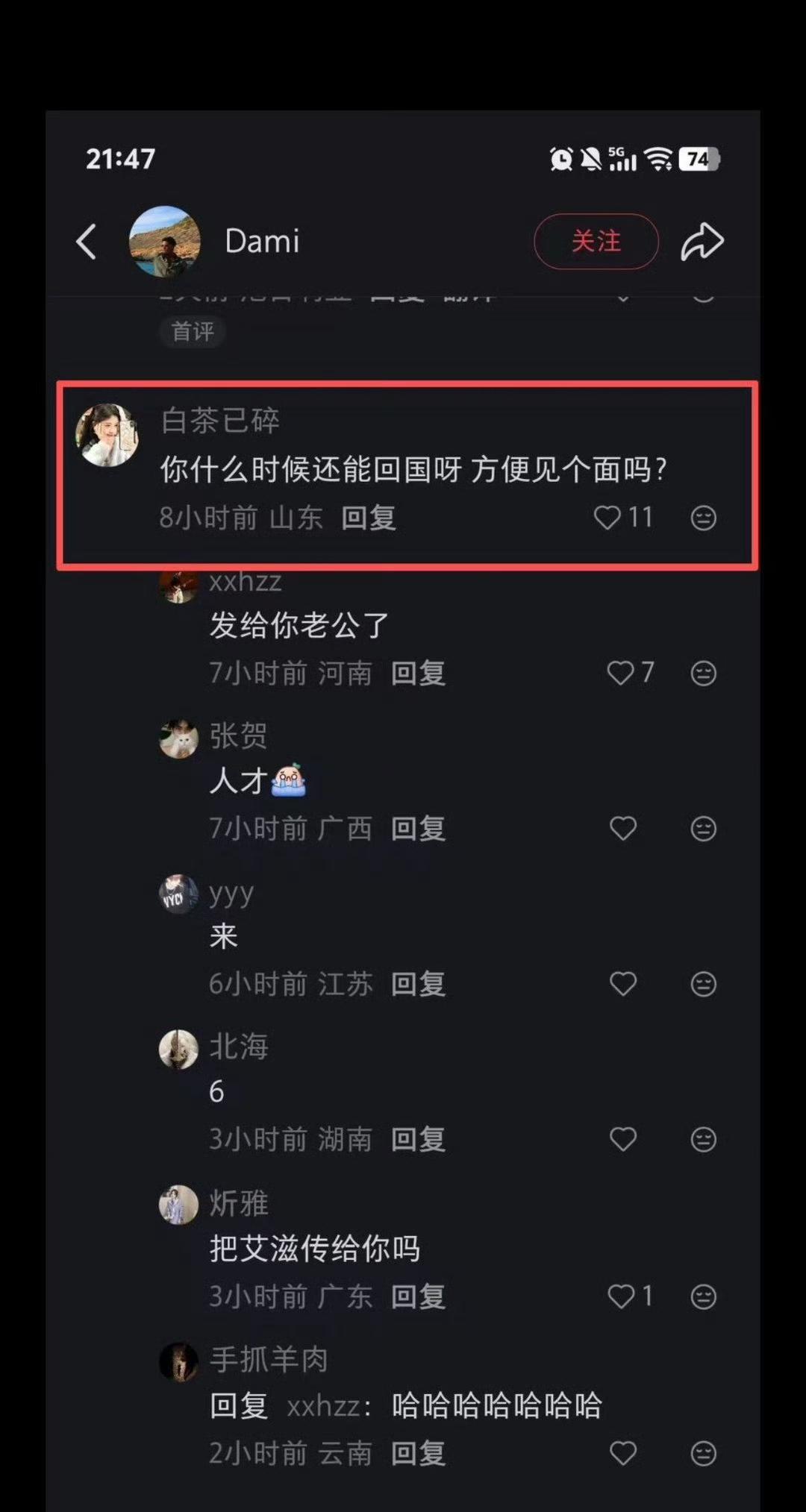 吃瓜啦! 近日,一个在中国待了12年的外国人,他发帖分享这12年里第一次回尼日利亚庆祝节日… 结果评论区有一个中国姑娘留言,“什么时候还能回国呀,方便见个面吗?” 这下好了,都知道你们之间有故事了… 不过看她自己之前发的帖,和中国老公携手7年,自己还要做贤妻良母,结果真相却这么扎心…自己那么喜欢怎么不嫁过去呢! 如今当事女方已经删评、改名字、清空自己的所有内容了…