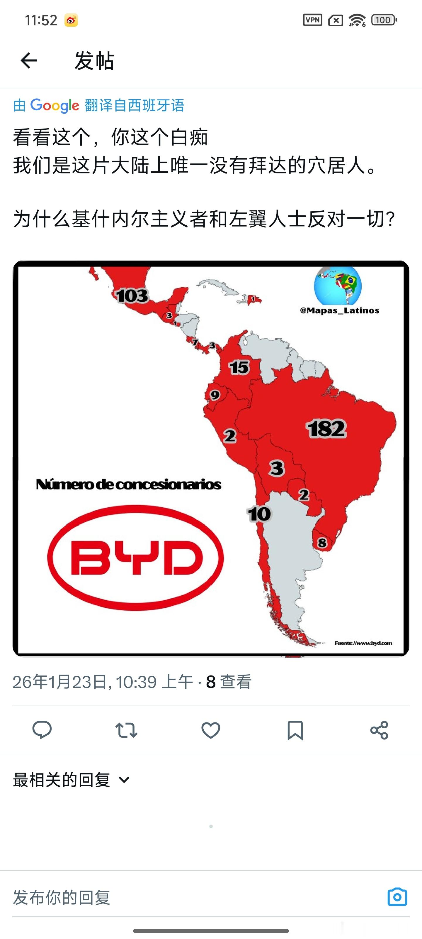 来自是阿根廷网友的吐槽,意思是:- “我们是这片大陆上唯一没有拜达的穴居人”:“拜达”是对“比亚迪(BYD)”的音译调侃,“穴居人”是自嘲阿根廷像“原始人”一样落后。在整个拉美大陆,只有阿根廷还没大规模铺开比亚迪的经销商网络(地图里阿根廷是灰色的,没有标注经销商数量)- “为什么基什内尔主义者和左翼人士反对一切?”:基什内尔主义是阿根廷前总统克里斯蒂娜夫妇代表的左翼政治势力,长期奉行贸易保护主义。网友认为正是这种保守政策,导致阿根廷没能像巴西、墨西哥等邻国那样,顺利引入比亚迪等外资品牌,让国家错失发展机会。配的地图也佐证了这一点:红色区域是有比亚迪经销商的国家(比如巴西标了182家、墨西哥标了103家),而阿根廷是灰色的,直观展示了它在拉美市场中的滞后状态。不过最近已经开始销售比亚迪汽车了,你们不再落后了,可以买到最先进的新能源汽车了🚗大v聊车比亚迪