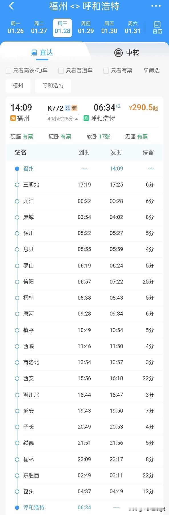 1月26日起,包头段担当的呼和浩特至福州直达快速列车开行,1月28日起,返程开行 要说包头没有去哪里的火车,那么福州算一个地方了,在包银高铁开通以后,包头又增加了去往福州方向的直达列车,首次将内蒙古和福建二省通过快速列车连接在一起。 这一对列车区间为呼和浩特至福州,1月26日起,首先k771次从呼和浩特发车,随后一个多小时经过包头,全程运行时间需要37小时,第3天才能到达福州,而在1月28号返程列车从福州出发,需要40个小时,经过包头回到呼和浩特,这趟列车往返需要七八天。 这一对列车不仅到福州是第1趟列车,到三明也是首趟列车,全程仅途经西安一座大城市。不过中小城市也比较多。 距离调图临近,坐上列车,终于可以将福建的武夷山茶和内蒙古的牛奶一起带上出发啦!
