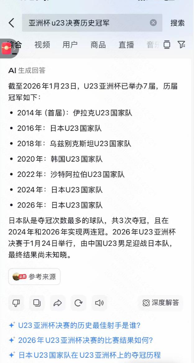 抖音AI默认日本是2026年U23亚洲杯冠军……连AI都不看好国足,连AI都歧视国足,国足更要争口气! 足球是圆的,一切皆有可能! 期待奇迹,期待U23国足能够打破歧视! 曾几何时,国足是日本仰望的存在。 而今,日本足球的领先,不过是片段,长久来看,国足必将碾压和统治日本,就像我们的国力一样。 大刀向鬼子们的头上砍去!