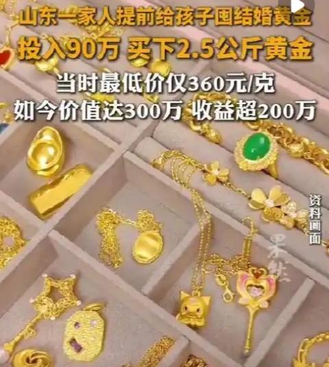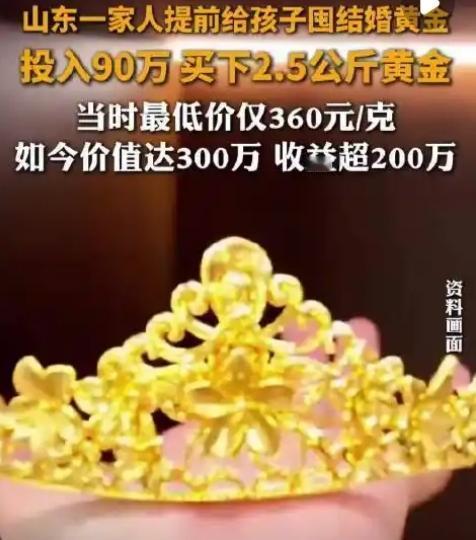 山东一家人给孩子囤2.5公斤结婚黄金,当时投入90万,如今受益超200万。 看到这组数字谁能不震撼?90万到300万的跨越,不是股市的侥幸暴涨,也不是创业的九死一生,而是山东这家人给孩子囤结婚黄金的“无心之举”。这背后藏着的不仅是金价上涨的红利,更是普通家庭对生活的清醒规划,顺着这份共鸣感,咱们往下深挖这波“神仙操作”里的人性与现实。 谁能想到,给孩子准备的结婚“三金”,居然能赚出一套房首付?山东潍坊这户人家最近彻底火了:几年前花90万给两个孩子囤的2.5公斤结婚黄金,如今市值飙到300万,净赚200万的消息刷爆全网,评论区直接炸成了大型“后悔现场”。 有人算过一笔扎心账:90万存银行定期,年利率3%存10年也才赚27万,而这家人靠黄金直接赚出近8倍收益,比大多数理财产品都香。更让人佩服的是,他们当初囤金的初衷特别纯粹——就是觉得结婚三金是刚需,早买晚买都得买,趁当年金价最低360元/克的时候分批入手,500克首饰加2公斤金条,慢慢攒成了孩子的“底气”。 放在当年,这波操作大概率会被吐槽“太冲动”。90万不是小数目,够全款买一套小房子,或是投入生意周转,怎么看都比囤一堆不能当饭吃的黄金靠谱。可现在回头看,这家人简直是“人间清醒”:黄金作为硬通货,抗通胀、稳保值的属性从未失效,尤其是近几年国际金价一路飙升,国内金饰价格从400元/克涨到如今的1500元/克,涨幅超3倍。他们没跟风追高股市基金,也没执着于波动的房产,而是瞄准“结婚刚需+黄金保值”的双重属性,把未来的消费提前,顺便赚了时间的差价。 最戳人的是当事人黄女士的态度:“不论涨多少都不会卖,这不是用来炒的,是给孩子们准备的结婚礼”。这份淡定背后,是父母对孩子最实在的爱——不只是200万的收益,更是不想让孩子将来被结婚成本压得喘不过气。反观现在,多少准新人因为金价暴涨陷入僵局?南宁有姑娘2022年约定买100克五金,当时预算6万足够,结果男友一拖再拖,如今金价破900元/克,同样的钱连70克都买不起,婚事也黄了。 评论区里,羡慕与后悔的声音此起彼伏。有人晒出自己的经历:“20年结婚买了钻戒,现在金价翻倍,后悔没把买钻戒的钱全买黄金”;有人感慨:“我妈当年提前5年给我囤三金,花12万现在值20万,装修钱都省出来了”;也有人无奈:“现在50克的镯子就干掉普通人一年工资,想囤也囤不起”。更有人点出关键:这家人的成功,不是运气好,而是懂“量力而行的远见”——用闲置资金投资,不杠杆、不跟风,把黄金当“传家宝”而非投机品。 其实这事儿戳中了所有人的痛点:在充满不确定性的时代,我们都在寻找既稳妥又能抗风险的生活方式。这家人没什么复杂的理财技巧,只是把对孩子的爱,变成了最实在的规划。他们证明了,真正的远见不是追风口,而是把刚需变成资产,把爱意变成底气。 不过话说回来,不是所有人都有90万闲钱囤金,也不是所有人都能精准踩中上涨周期。但这份“提前规划、稳健布局”的思路,却值得每个人借鉴。你觉得这家人的做法值得学吗?如果是你,会提前给孩子囤结婚黄金吗?欢迎在评论区聊聊你的看法,说说你身边的囤金故事!黄金囤积热潮 结婚黄金推荐