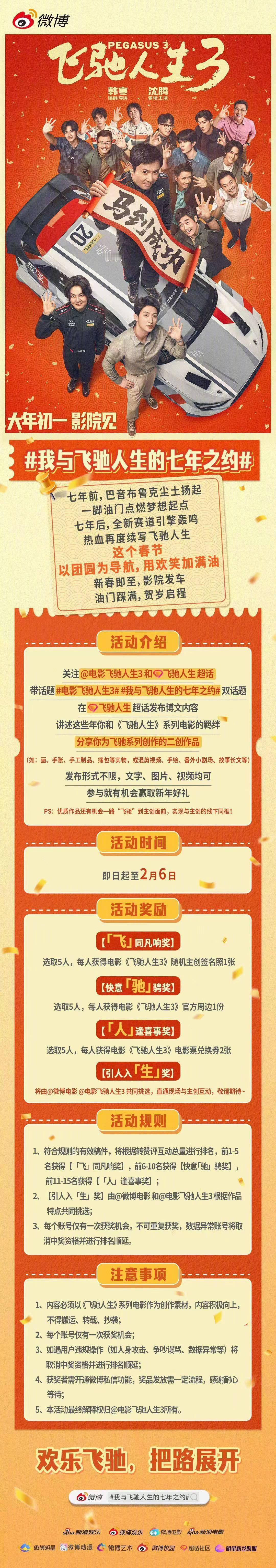 七年之约,一路轰鸣。《飞驰人生3》有奖互动开启了!即日起到2月6日,进入飞驰人生 ,带电影飞驰人生3 我与飞驰人生的七年之约双话题,讲述你和《飞驰人生》系列电影的羁绊,分享你为飞驰系列创作的二创作品,有机会get随机主创签名照/官方周边/电子票码!优质作品还有机会和主创线下同框喔~更多活动详情见下方长图👇