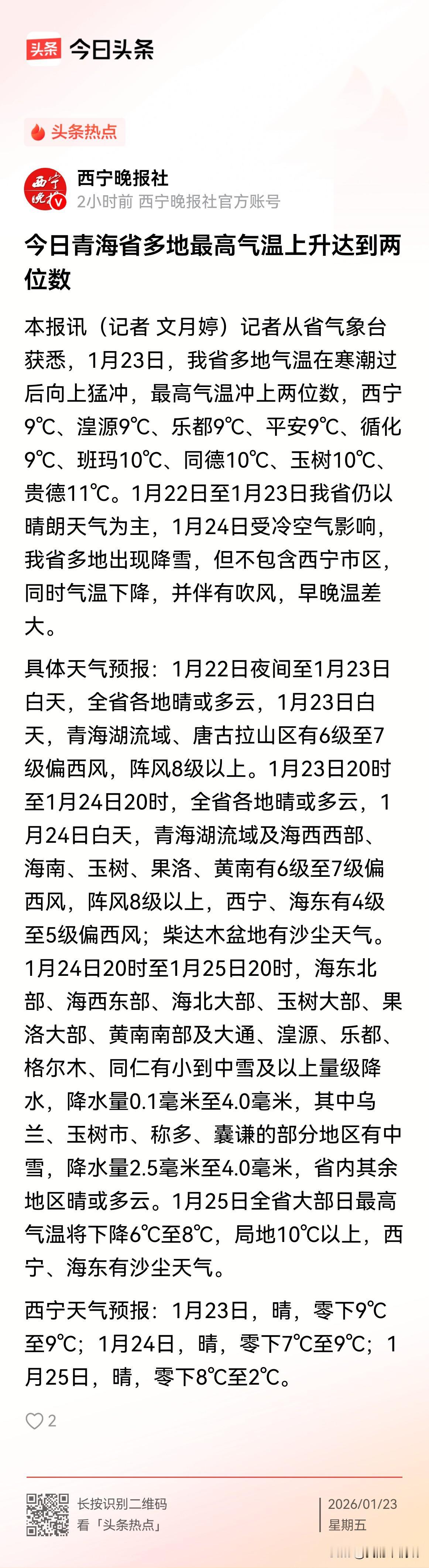 哎呦喂,西宁今天的气温直接飙升到9°C了,这哪里是冬天的样子,根本就是春天到了! 家人们,青海这天气简直太反常了!哪还有一点冬天的影子?今天看新闻,西宁的温度居然飙升到了9°C !青海省好多地方的最高气温上升幅度都达到了两位数。 寒潮刚过,今天多地气温就猛冲。西宁、湟源、乐都等地都到了9℃,班玛、同德、玉树10℃,贵德更是有11℃ 。这哪像是冬天该有的温度?羽绒服都穿不住了。 不过,好天气也没几天。天气预报说,从24号起,冷空气又要来,好多地方要下雪,虽然西宁市区没份,但气温会降,还吹风,早晚温差大得很。后面几天还有沙尘天气,大家出行可得注意安全,及时增减衣物!