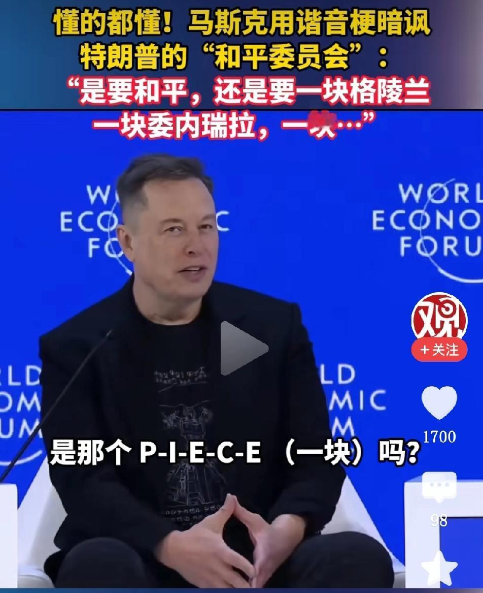 马斯克巧用谐音梗暗嘲特朗普的“和平委员会”。他借助英文里两个同音词peace(和平)与piece(块、片),以此戏谑特朗普的“领土野心”:“我听闻要举办和平(peace)峰会,当时我就在寻思,说的是那个‘p-i-e-c-e’吗?”马斯克笑着解释道,“你懂的,就像一小块格陵兰岛,一小块委内瑞拉,一小块……”