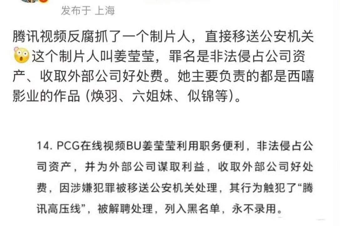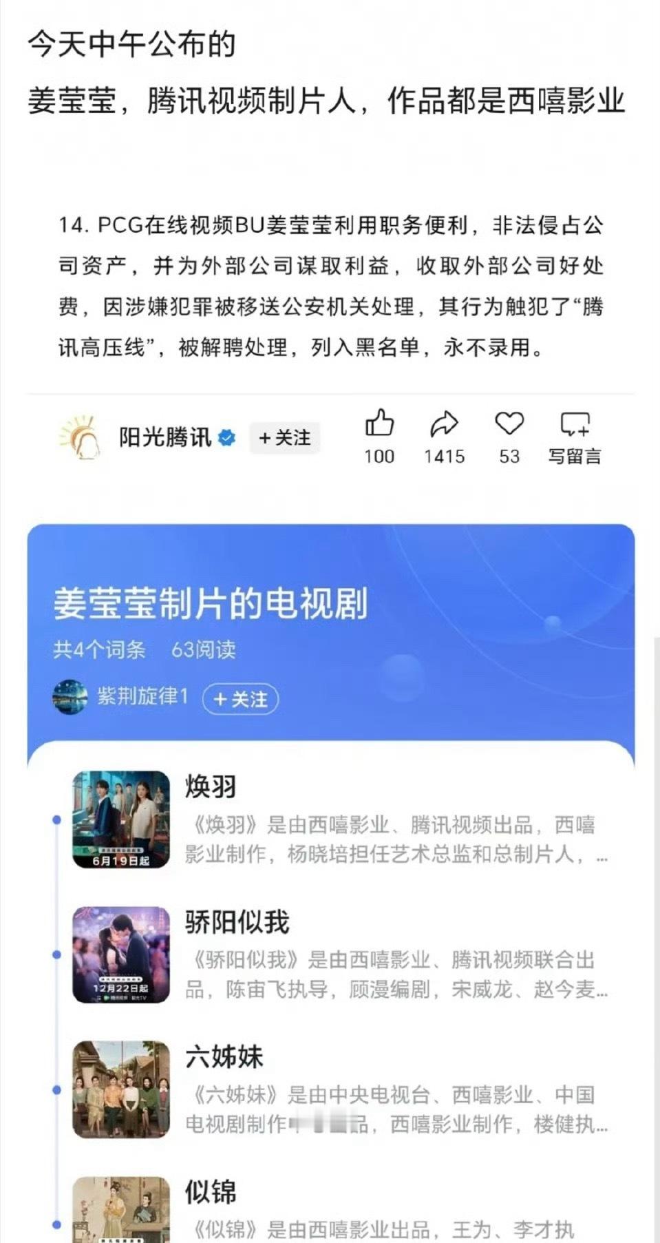 🐧反腐抓的这个制片人,参与制作的是焕羽 骄阳似我 六姊妹 似锦,全是西嘻影业的