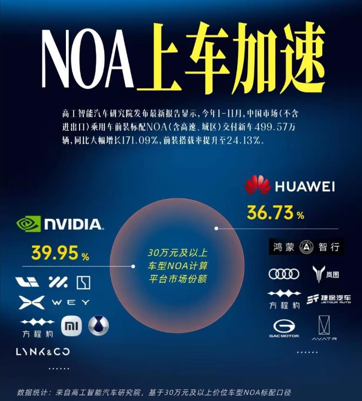 英伟达与华为平分秋色。根据第三方最新的研究报告,30万以上乘用车NOA计算平台,英伟达的市场份额与华为旗鼓相当。2026年,随着鸿蒙智行新车加快上市,越来越多的汽车厂家加入Hi模式,华为的份额有望进一步扩大,对英伟达的领先优势也会进一步扩大。如果造车新势力蔚小理等选择华为的话,那么英伟达就岌岌可危了。