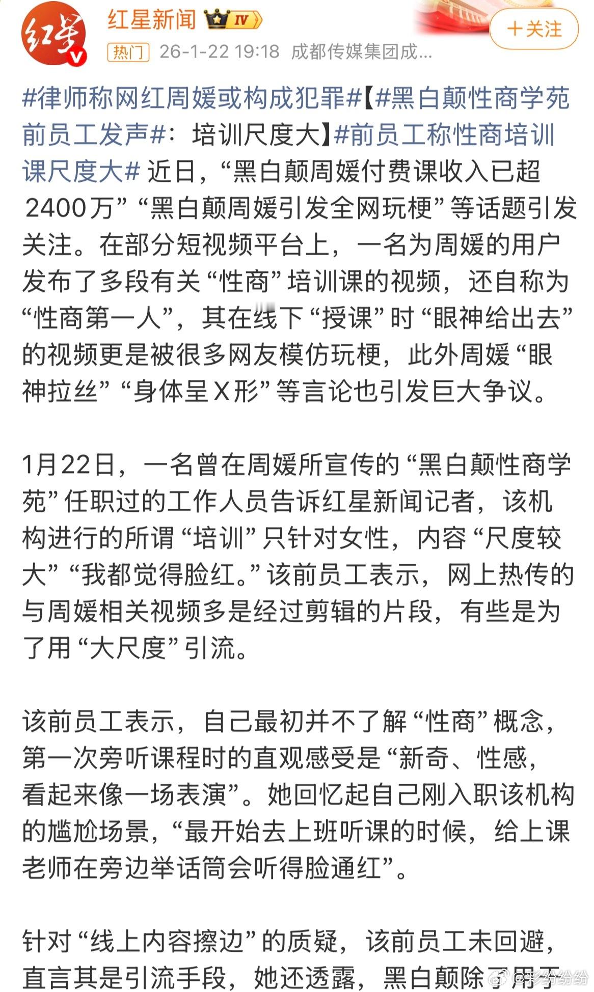 线上课:9.9元引流课至4980元三天"异性交往训练营";线下课:2999元两天训练营至8.8万元"导师班",需提前预约,月均超10场;付费学员数万人,总收入超2400万。没错,这就是所谓的“性商课”的现实情况。“性商课”,简单来说就是教人“媚男术”的那种课程。古代青楼里也有的,教新手的“姑娘”怎样魅惑“恩客”。现在“性商课”的市场为什么这么好,有数万女子往里头送钱呢?无非就是抓住了有的人想通过捷径快速钓到“金龟婿”罢了。现在付出点成本不算什么,只要有人上钩了,自然能得到巨额的回报,主打一个钱多人傻的人一套一个准。不想靠自己的努力生活,也不想凭自己的个人魅力吸引人,而去交“性商课”的智商税,开课敛财的固然有问题,那些趋之若鹜、大把送钱的人也该清醒点吧。还是那句话,只要你心术正,不想赚快钱、走捷径,没有人能骗到你。前员工称性商培训课尺度大前员工称性商培训课尺度大