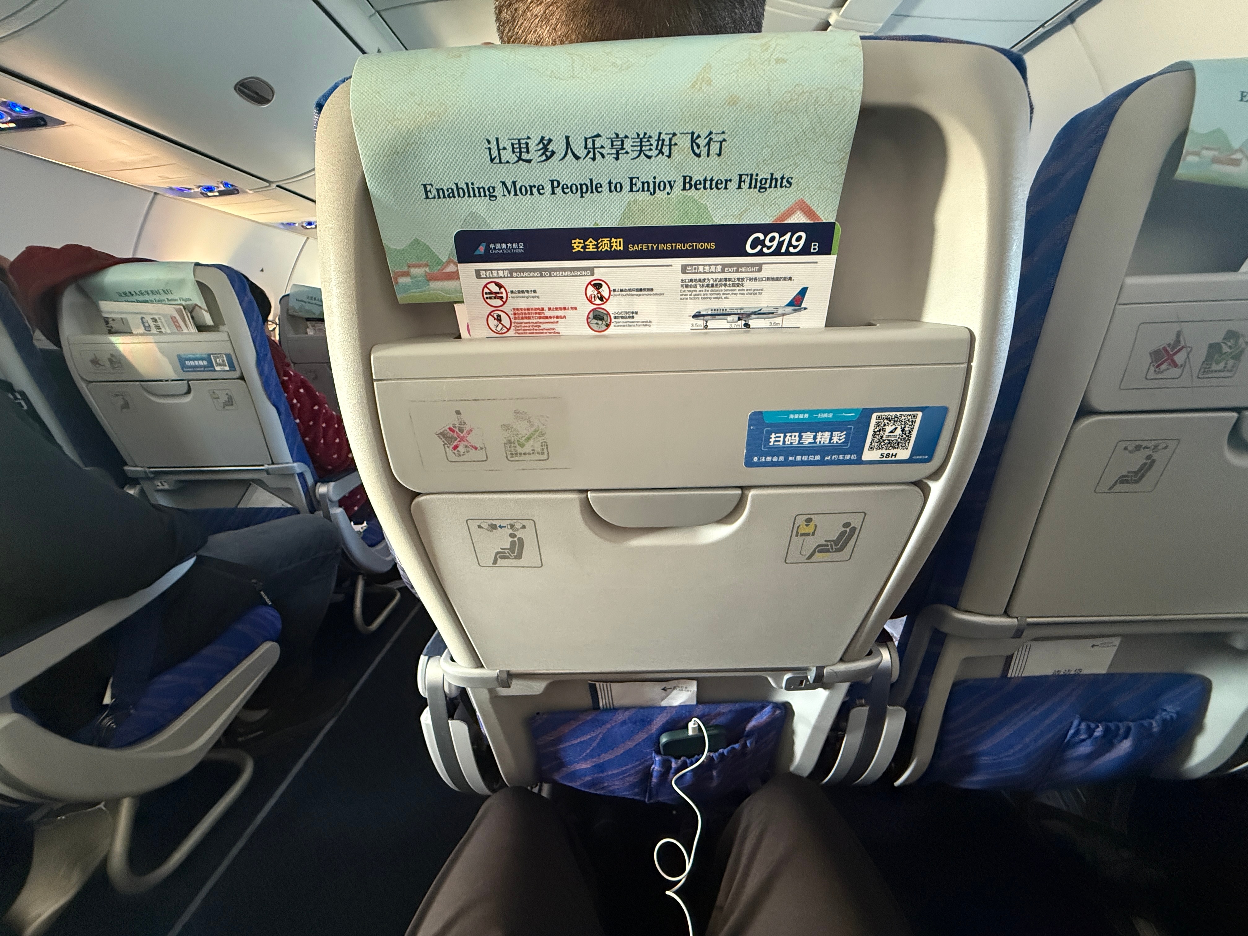到达才发现今天坐的是C919,腿部空间宽敞,放手机的袋子人性化!