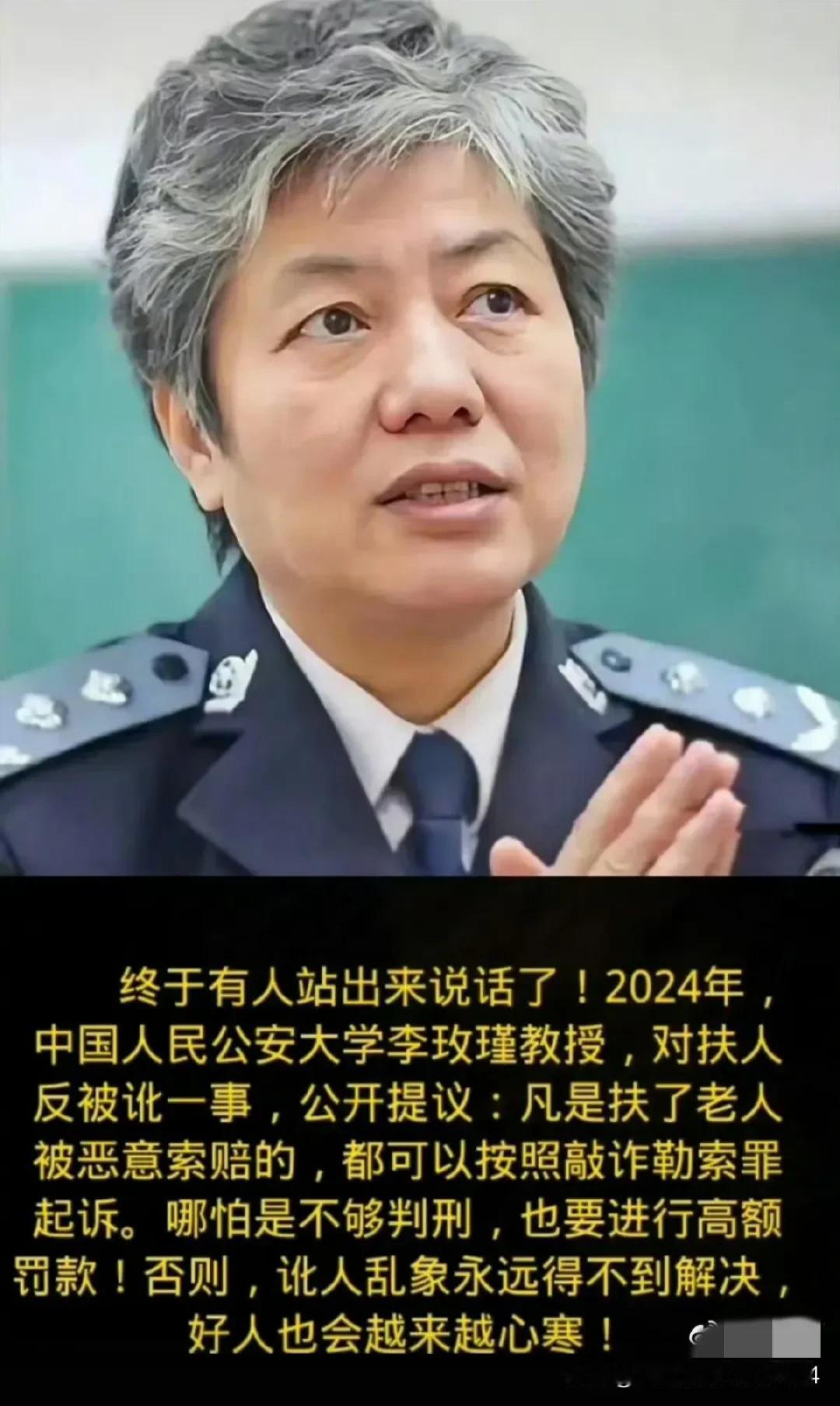 终于有人说句公道话! 公安大学李玫瑾教授建议: “凡是扶了老人被要求天价赔偿的,在老人拿不出任何证据的情况下,可以按‘敲诈勒索’起诉。即便不能够判刑,也要高额罚款,进行严惩!” 教授的话真是说到很多人心坎里了,凭什么因为一些人年纪大了,做了坏事,也能被“原谅”? 这对于那些出于善良帮助他们的人来说,太不公平了!如果真的被讹上,有的人很可能会赔上全部身家、乃至人生! 不论年龄大小,何时各地,善良被欺负,都是不可取的!不能让好心人心寒,支持李玫瑾教授!