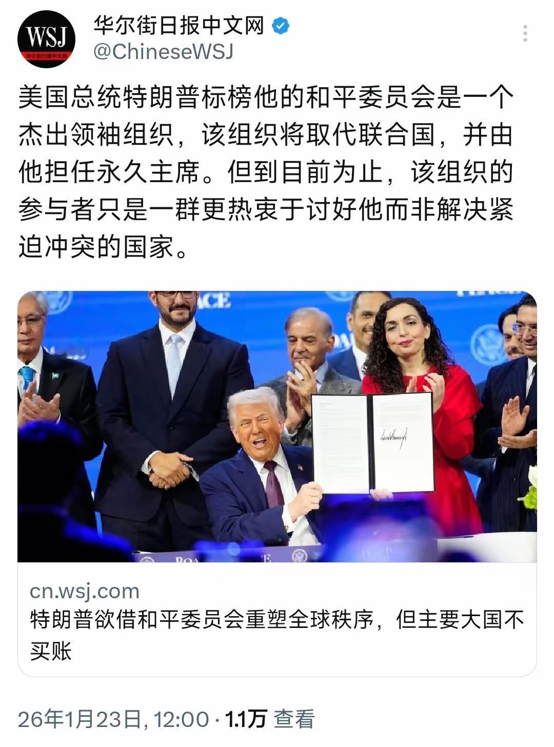 华尔街日报今天(1月23日)写道:“美国总统特朗普标榜他的和平委员会是一个杰出领