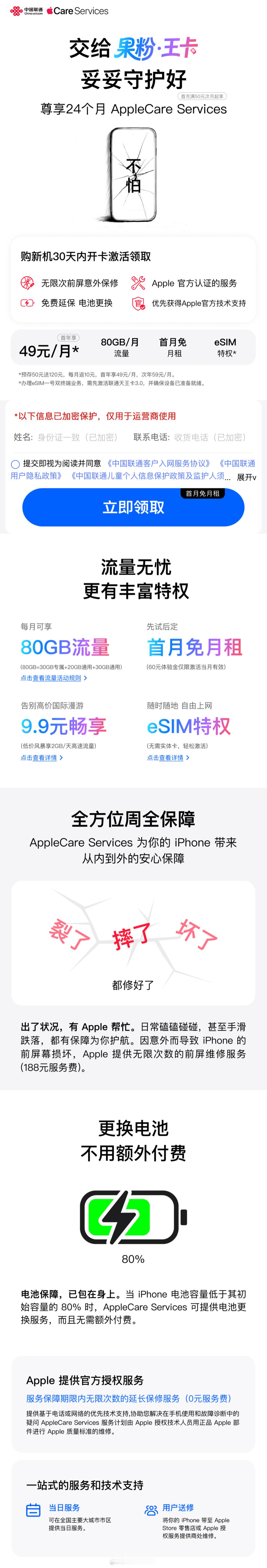 联通出了个「果粉·王卡」套餐,套餐内含 24 个月 Apple Care,感觉性价比还可以。不过两年过后,没有了 Care 权益,这张卡就鸡肋了。资费情况是首年 49 元/月(预存 50 元送 120 元,每月返 10 元),首月免月租,次年 59 元/月。每月含 30GB 联通王卡专属流量(腾讯系、部分应用),20GB 全国流量,参与乐享活动送 30GB 全国流量。超出套餐,1GB / 5 元,语音 1 分钟 / 0.1 元,短信 1 条/ 0.1 元。Apple Care 的服务商不是苹果官方,而是苹果授权服务商。