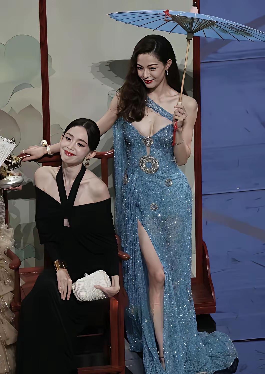 在钟楚曦面前,古力娜扎都得黯然失色! 原以为古力娜扎的颜值已经是倾国倾城了, 但是和钟楚曦一对比还是稍逊风骚, 不得不说钟楚曦是真敢穿, 这么一套低胸蓝色长裙, 很多女明星都不敢穿,觉得太过暴露, 但是钟楚曦却完全不怕尴尬, 把自己的美好身材给展现出来。 所有人的焦点都转移到钟楚曦身上, 哪怕旁边是文咏珊和古力娜扎两位大美女, 所以说可爱在性感面前面前一文不值。