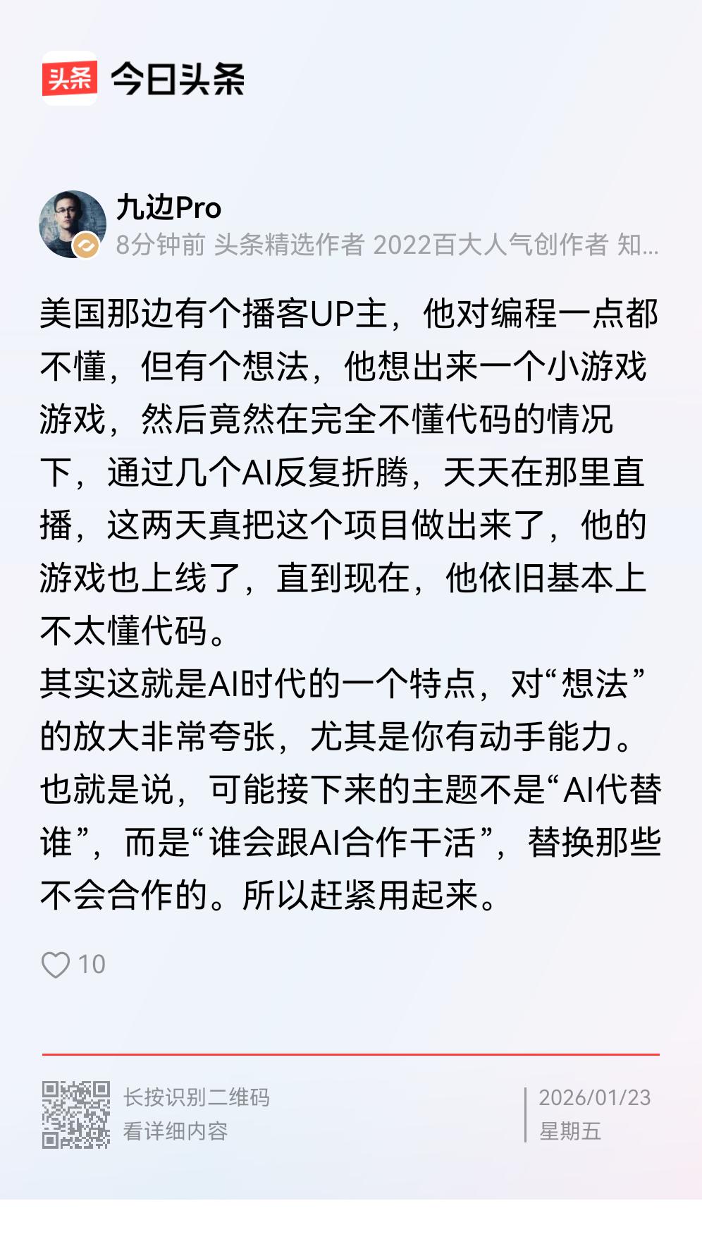 AI时代对于很多人来说都是一个巨大的机遇,它意味着你在不掌握相关专业知识的情况下,也能按照自己的想法制作出惊人的产品。正如九边所举的这个例子,一个对编程没有一点了解的人,仅仅凭借自己一个想法,就用AI制作出了一个游戏。 AI在这里并不是大众所想象的人类的对手,而是一个帮手。以前人们做事情,需要汇聚来自各行各业的人才共同努力,但未来或许这些事情你一个人再加一个AI就能做到,有了一个AI,就等于有各行各业的优秀人才都来你麾下为你效力,帮助你实现你的想法。 技术的发展是为了解放人类的生产力,AI是能做到这一点的,它可以让我们将更多的时间放在如何去形成某一个惊艳的想法,而不是像之前那样有了一个想法之后,要将这个想法落实,还需要因此而处理大量琐碎的事务性工作,那样其实浪费了很多人的精力,消磨了很多人的热血。 现在AI还只是在编程、绘画、文章小说等线上网络领域起作用,相信未来随着AI继续发展,其影响力终究能够彻底突破那一层线上与线下的界限,降临现实世界,总体上来讲这肯定是一个非常令人乐观的场面。