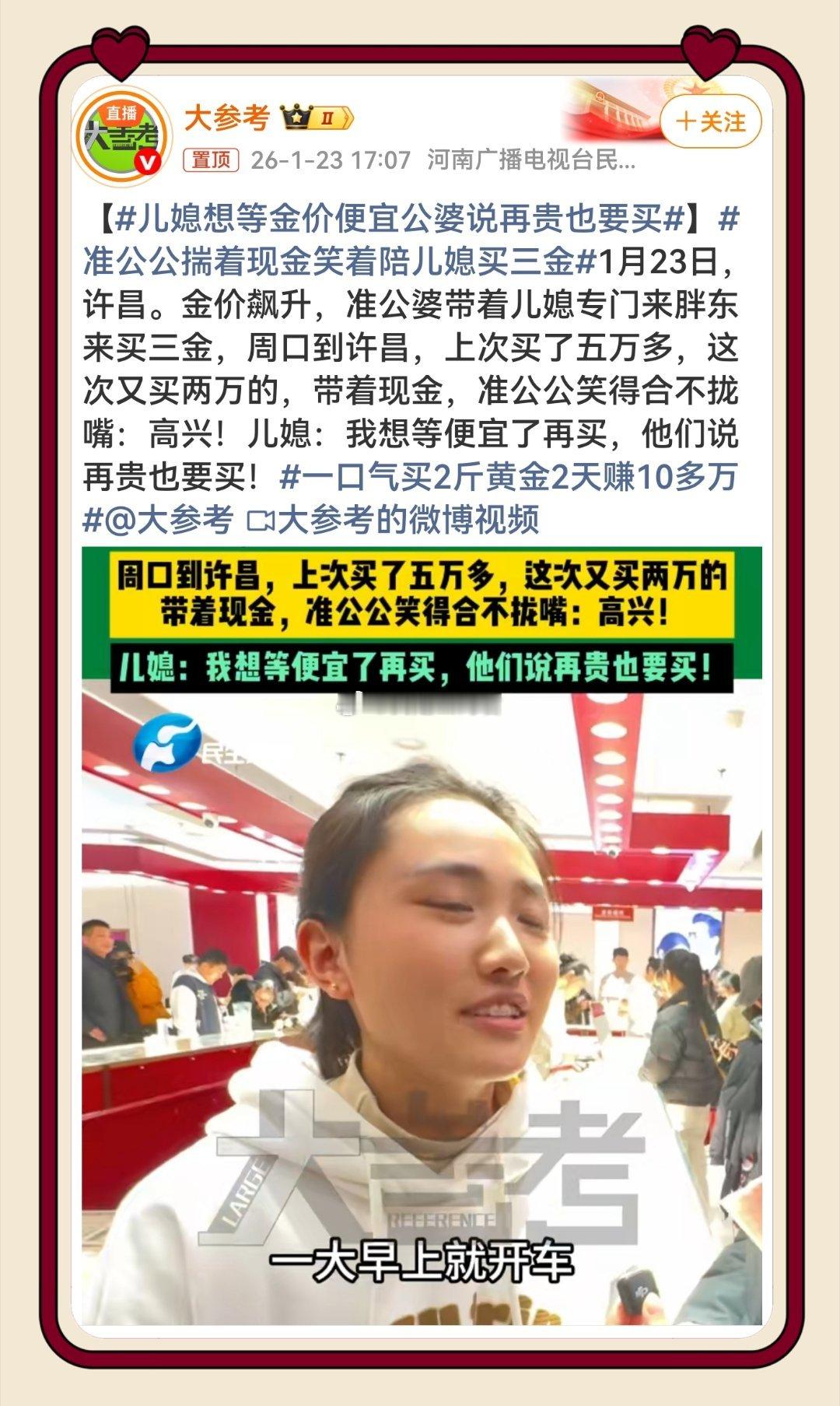 儿媳想等金价便宜公婆说再贵也要买 金价虽冷,人情滚烫。周口到许昌的专程奔赴,胖东来柜台前的现金交付,是公婆用最朴实的方式为婚姻“压秤”。金价涨跌是经济曲线,但“再贵也要买”背后,是比黄金更稳当的心意——这哪是买三金,分明是提前为家庭存入第一笔情感保值资产。金价暴涨黄金存款被爆买金价疯涨原因 锦州·晓波烧烤(南桥店)