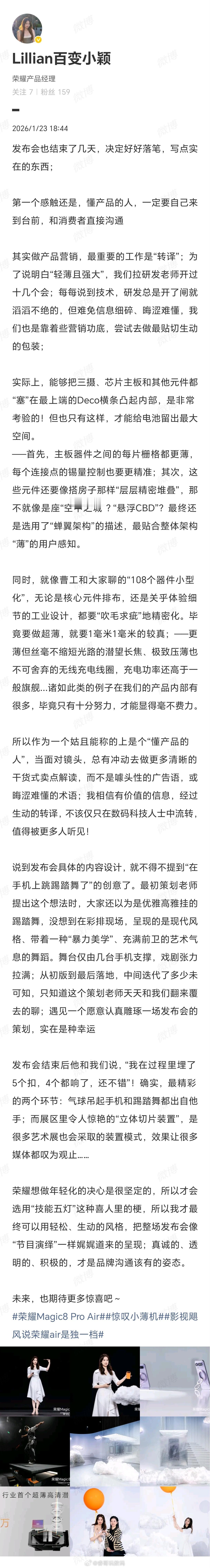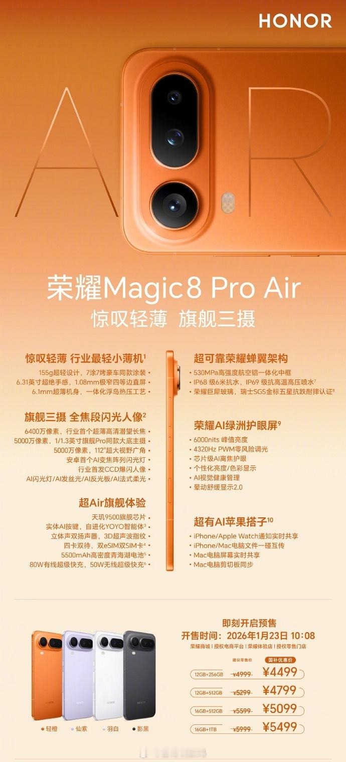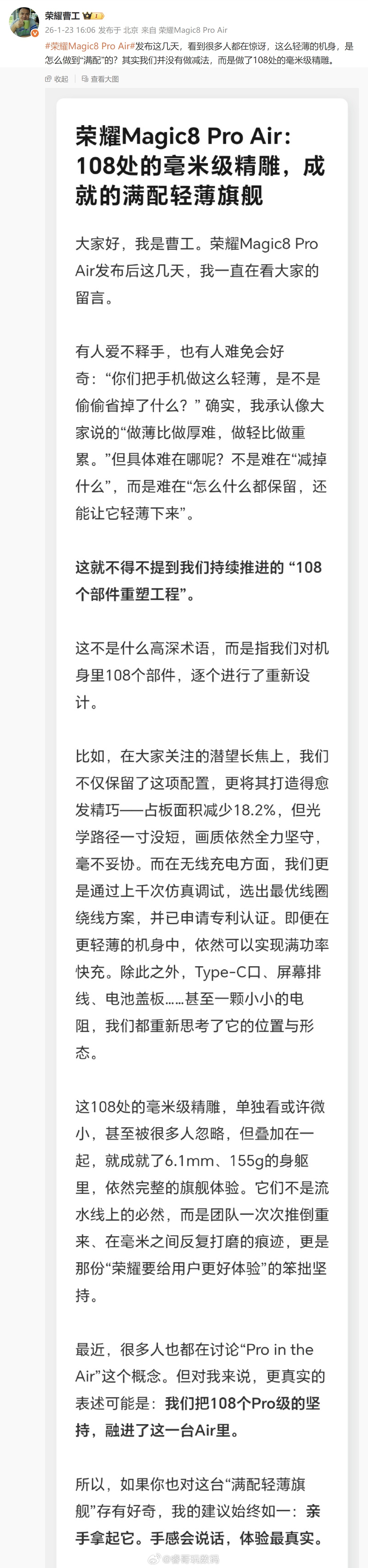 荣耀工程师称做Air不代表阉割配置荣耀Magic8 Pro Air 的轻薄不是“省”出来的,是一个个定制小型化器件仔细“编织”出来的。荣耀工程师们突破工艺的极限、挑战技术的巅峰、打磨极致的体验,将最前沿的科技汇聚于小巧轻薄的6.31英寸、6.1mm、155g机身内。