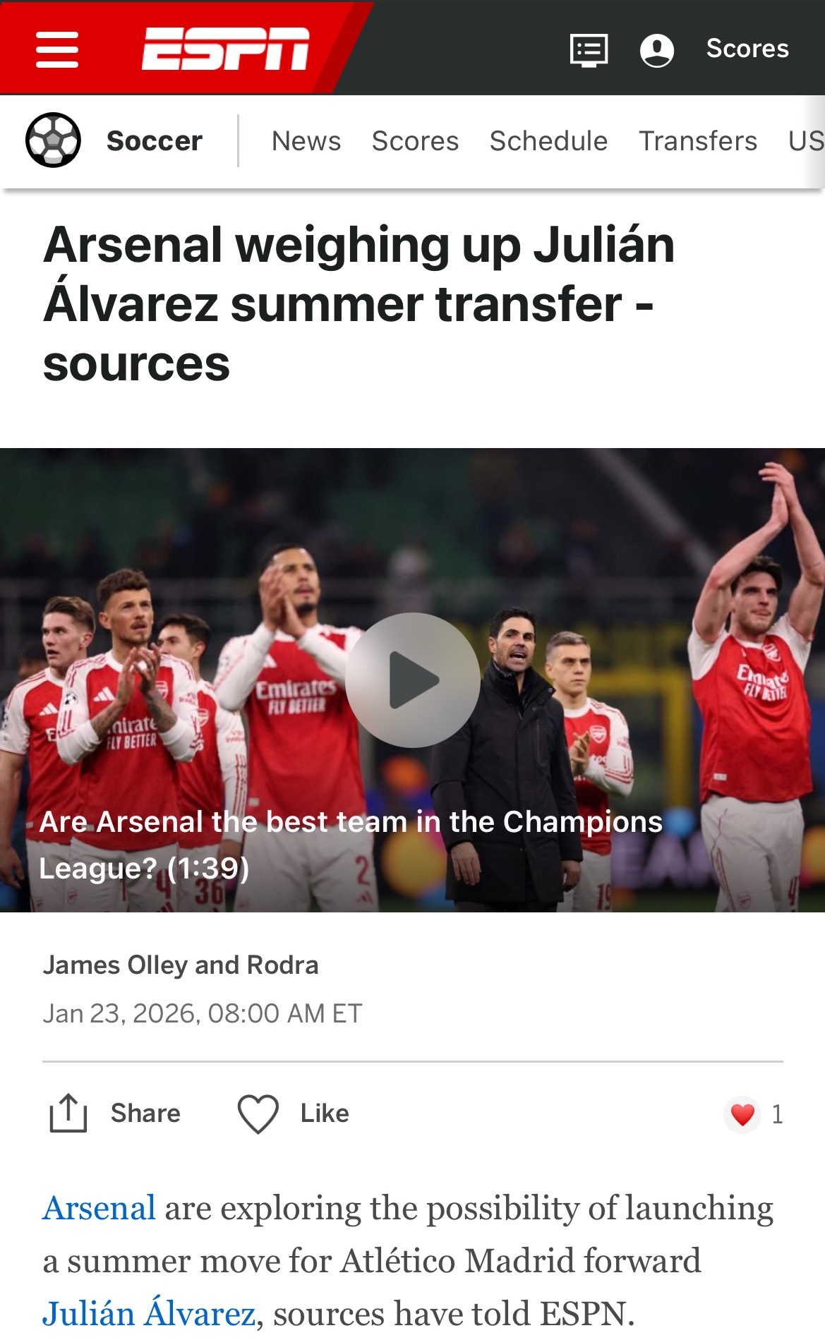 ESPN James Olley:消息人士向我们透露,阿森纳正在探索2026年夏季转会窗引进马德里竞技前锋阿尔瓦雷斯的可能性。枪手体育总监贝尔塔与这家西甲俱乐部关系密切,他在去年三月转投北伦敦之前,曾在该俱乐部工作了12年。贝尔塔在2024年8月操作了阿尔瓦雷斯从曼城以9500万欧元转会至马竞的交易,消息人士称他与球员的经纪人伊达尔戈及其团队保持着密切联系。巴塞罗那对阿尔瓦雷斯有浓厚兴趣,但他们持续的财务困难似乎使这种规模的潜在交易复杂化。据信阿尔瓦雷斯的合同中包含高达5亿欧元的解约金条款,但西班牙消息人士表示,如果马竞愿意出售,他们今夏会要求超过1亿欧元的转会费。自加盟马竞以来,阿尔瓦雷斯在85场比赛中打入40球,合同至2030年到期。阿森纳方面接触的确切性质尚不清楚,但消息人士称,俱乐部官员已进行非正式询问,以确定交易是否可能,然后再权衡是否在今年晚些时候正式表达兴趣。消息人士告诉ESPN,在去年夏天从葡萄牙体育签下哲凯赖什之前,阿森纳曾将阿尔瓦雷斯列为数名前锋候选之一。哲凯赖什在枪手的开局喜忧参半。这位27岁的前锋在周二欧冠战胜国际米兰的比赛中打入了本赛季第9球,但他一直难以复制在葡萄牙体育两个赛季场均近一球的惊人状态。他目前已出场27次。热苏斯在对阵国米的比赛中梅开二度,并表达了希望在2027年到期的现有合同后继续留队的愿望。然而,热苏斯确认尚未就续约进行任何谈判,且有消息称阿森纳可能愿意在赛季末听取对这位巴西前锋的报价。随着凯·哈弗茨即将完全康复,阿森纳将继续在四条战线竞争。在俱乐部的三名前锋均无法出场时,中场梅里诺曾客串过前锋。