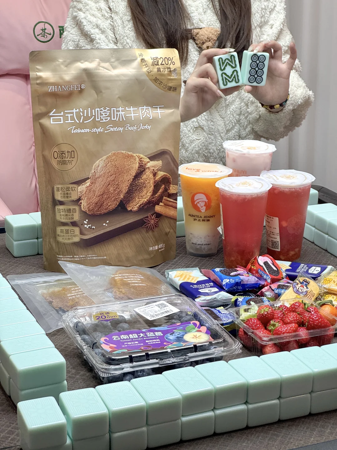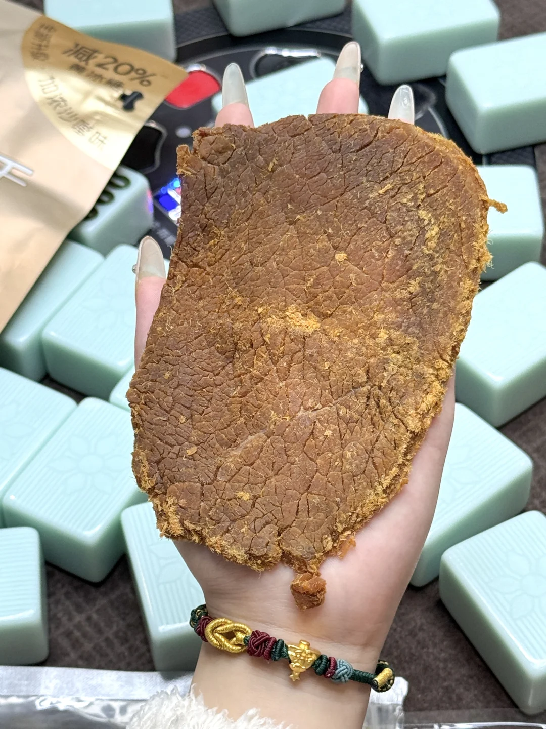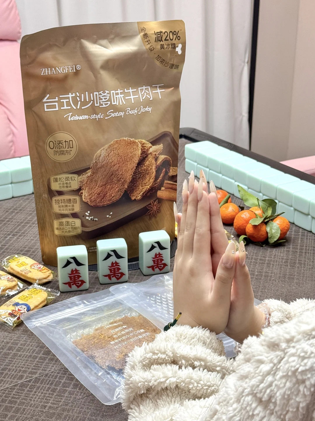 当然是组一桌麻将大杀四方🎉 现在和搭子们搓麻将的标配不是🚬🍸 而是满桌零食饮料🍢 一边吃零食一边搓麻将真的很爽啊 我的心头好就是这个沙嗲味牛肉干 浓郁的沙嗲味,就像刚杠上开花时幸福的甜 输赢不重要,主打一个边吃边玩的松弛感 这才是生活该有的样子啊~