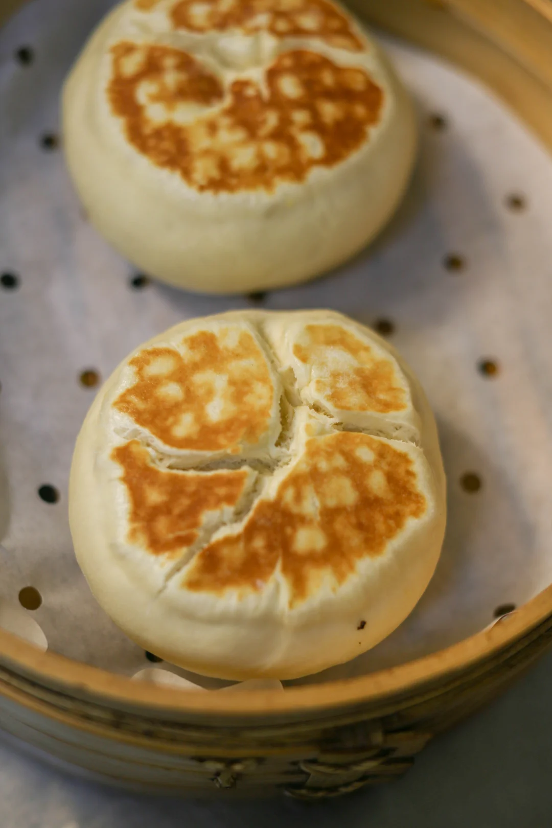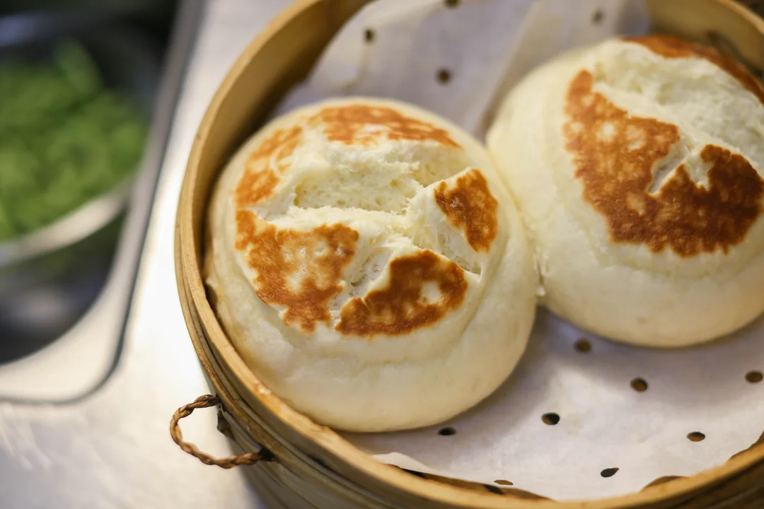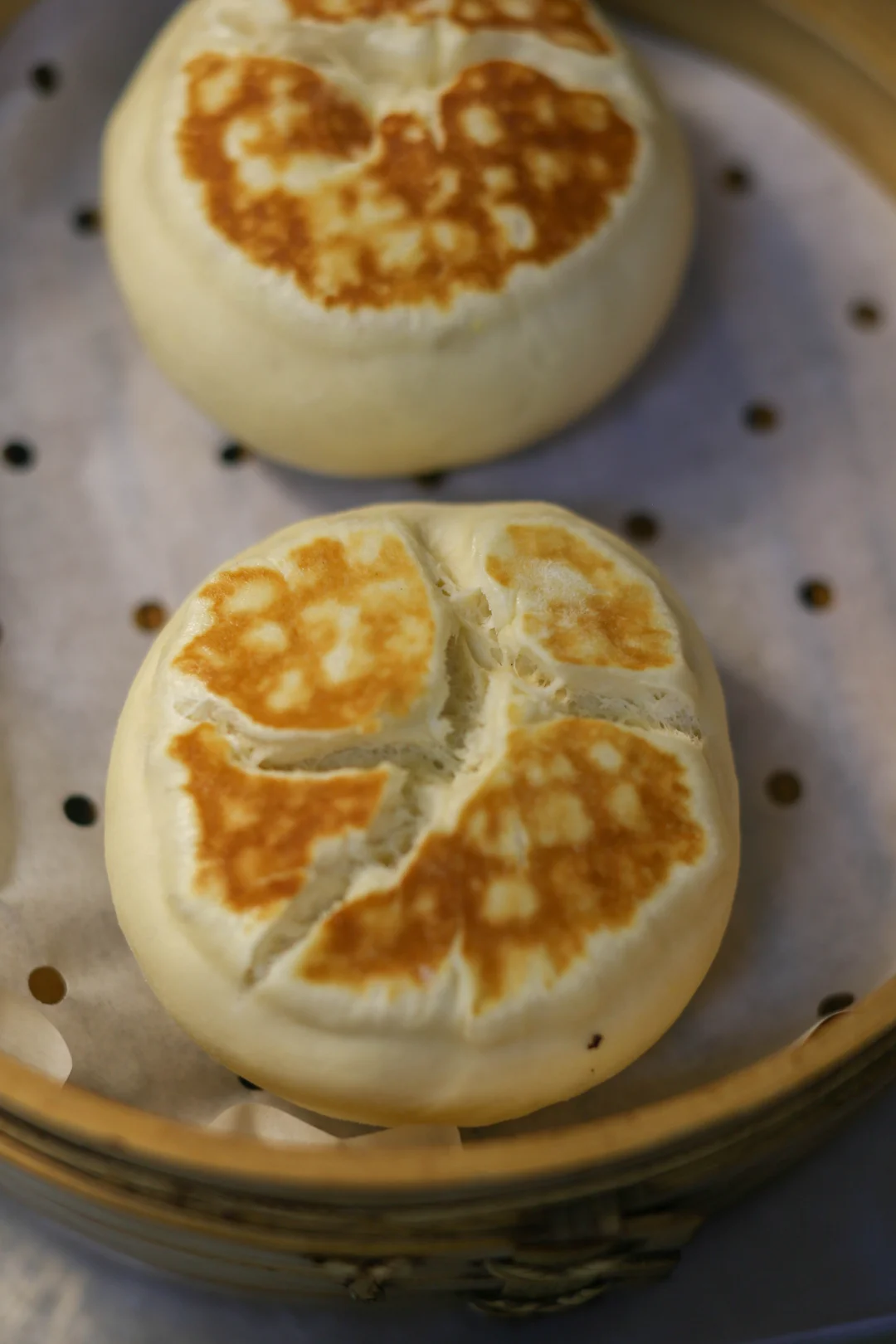 8:蒸锅提前烧好热水,把煎好的馒头放入蒸锅中,可以顺着揉面的纹路再把那个缝隙稍微打开一些,不要破坏面团的组织,上汽后20分钟即可。