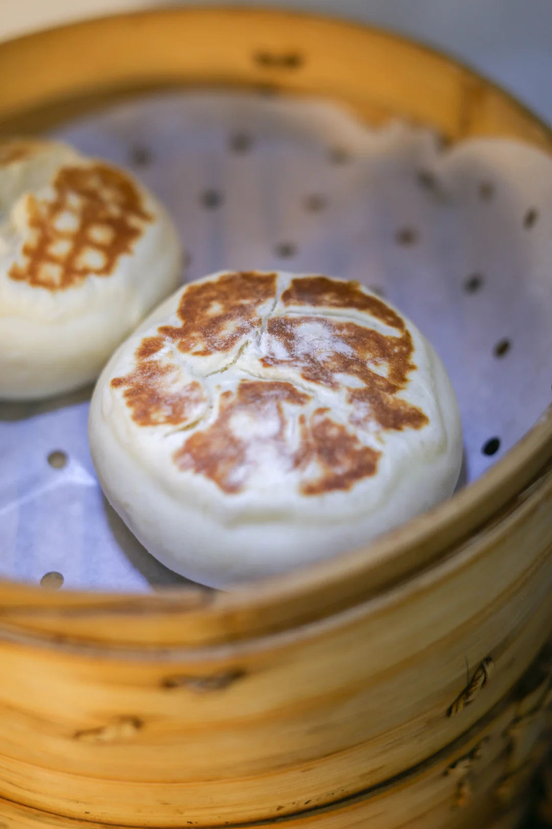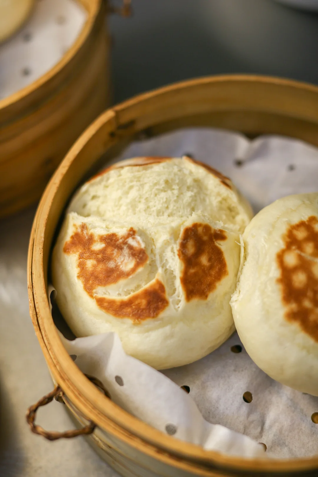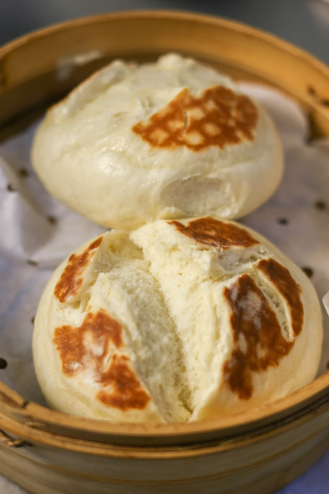 8:蒸锅提前烧好热水,把煎好的馒头放入蒸锅中,可以顺着揉面的纹路再把那个缝隙稍微打开一些,不要破坏面团的组织,上汽后20分钟即可。
