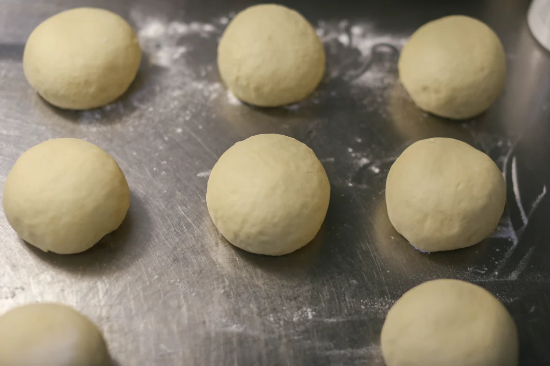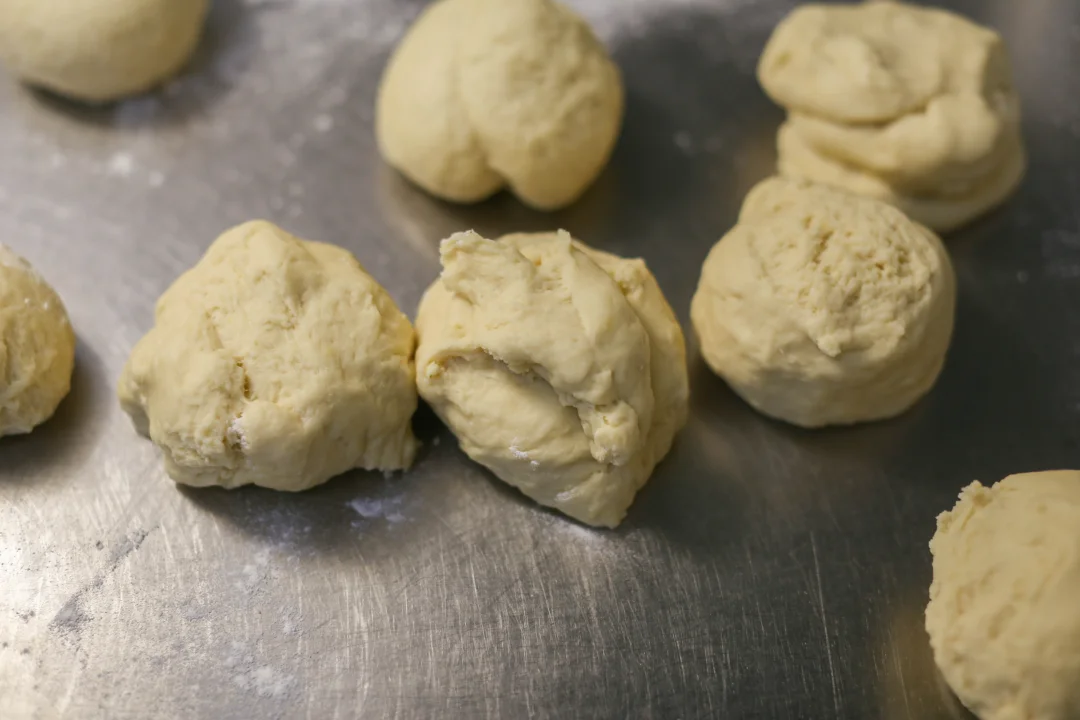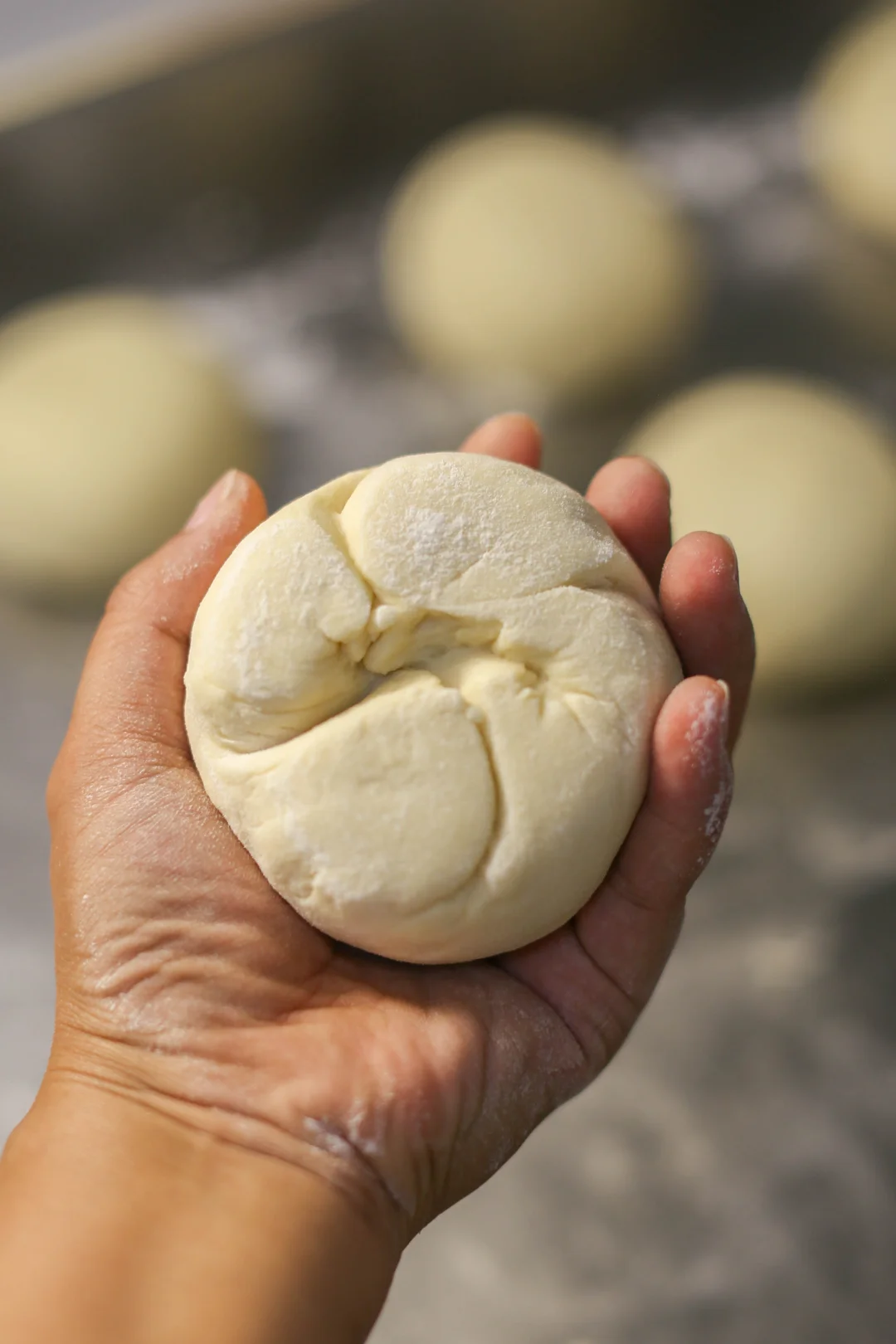 4:开始揉面,揉成光滑的面团,搓成长条,分成200克一个的剂子,用大拇指按住面团的一个地方,用其它四个手指揉搓,这样反复5-6下,底部就自然有像隔开的裂缝一样,蒸的时候就自然开花了。