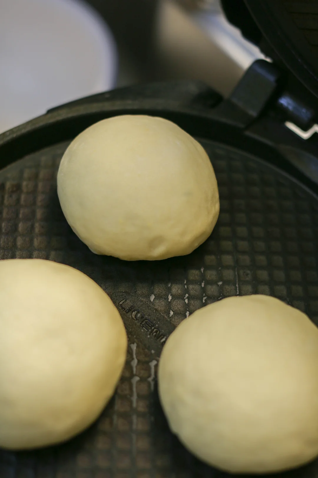 7:电饼铛提前预热好,不用放油,把饧发好的面团底部朝下,底部煎出金黄色嘎渣就行。