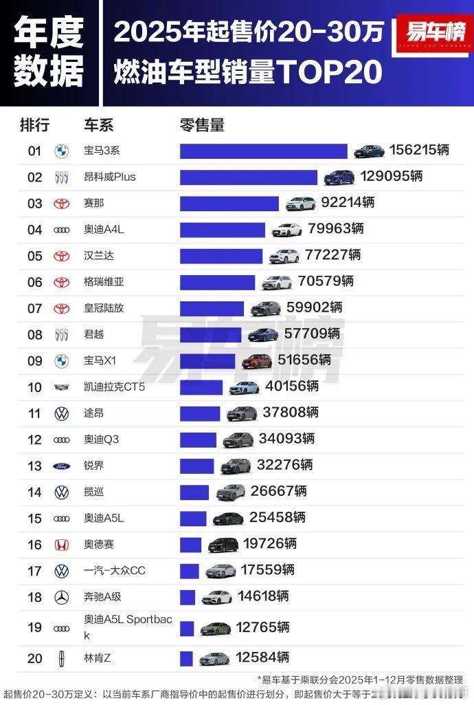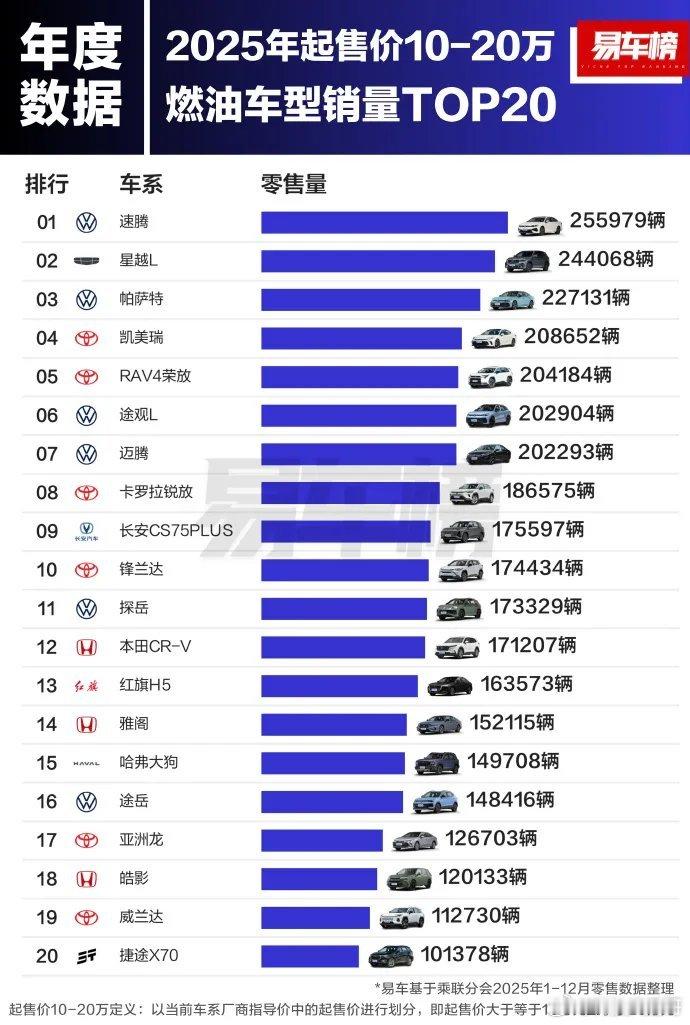 科技犬总结 看完这四张2025年燃油车销量榜,感觉就像看完了一部《燃油车江湖的生存现状与突围战》的纪录片,信息量十足,而且特别有嚼头。下面我就用大白话,给你捋一捋这里面的门道和看点。央视转播U23国足与日本比赛首先,总的基调就是:燃油车的基本盘,依然稳得一批,但内部已经“卷”出了新高度、新格局。咱们按价格从低到高来说:1. 10万以下市场:国民神车的“守擂战”,SUV正在颠覆轿车霸权这个价位段,说白了就是最广大家庭的第一辆车,图的就是个 “经济实惠又靠谱”。冠军毫无悬念:日产轩逸,32万辆的销量,一骑绝尘,不愧是“家轿之王”。朗逸紧随其后,这两款车就是 reliability(可靠)和实用性代名词,是很多人闭着眼买都不会错的选择。最大亮点是第三名:吉利博越L!一款起售价不到10万的SUV,居然能冲到季军,销量23万多,这释放了一个超级强烈的信号——老百姓对“大空间”的追求,已经压倒了对“轿车更省油”的传统执念。花同样的钱,能买到一个更高、更宽敞、通过性更好的SUV,吸引力太大了。瑞虎8排第四,也是这个道理。这个市场,国产SUV正在猛烈冲击合资轿车的传统地盘。另一个看点:榜单里能看到五菱宏光V和S这样的“回本利器”,也有荣威i5、MG5这样的高性价比轿车。说明这个市场虽然总量大,但需求非常多元,既要拉人又要拉货的,有;就想买个漂亮代步车的,也有。2. 10-20万市场:合资与国产的“绞肉机”战场,胜负难分这是竞争最惨烈、车型最多的区间,堪称“中级车修罗场”。速腾夺冠,但优势并不算巨大。星越L(24.4万)、帕萨特(22.7万)、凯美瑞(20.8万)咬得非常紧。这说明在这个核心价位,没有一家有绝对统治力。合资“常青树”依然能打:帕萨特、凯美瑞、RAV4荣放、CR-V这些名字,销量依旧坚挺,证明其品牌口碑和产品力经过了长期考验。国产品牌已全面崛起:星越L、长安CS75 PLUS、红旗H5(榜单中的“红旗”)、哈弗大狗,这些车不仅上榜,而且排名相当靠前。尤其是星越L,作为国产燃油SUV,能压过一堆老牌合资SUV冲到第二,太提气了!这说明在15万左右的价格带,国产车在设计、配置、动力和空间上,已经具备了和合资正面硬刚、甚至局部领先的实力。消费者用真金白银投票,不再盲目迷信合资标。3. 20-30万市场:品牌价值开始凸显,“面子”和“里子”的博弈价格上到20万,买车就不光是工具属性了,品牌溢价和社交属性开始起重要作用。宝马3系以超过15.6万的销量断层式领先,比第二名昂科威Plus多了近3万辆。这说明到了这个价位,豪华品牌的运动基因和品牌光环,吸引力是巨大的。“开宝马坐奔驰”的观念依然有市场,3系是这个价位很多人圆“蓝天白云梦”的首选。一个有趣的现象:榜单里混进了赛那和格瑞维亚这两款MPV,而且销量不俗。这说明在20-30万区间,满足多人口家庭高品质出行的MPV,成为了新的增长点。大家不仅要开得爽(宝马3系),也要坐得舒服(MPV)。这个区间的榜单,已经是合资品牌和豪华品牌入门车型的天下,国产车身影几乎消失。冲高之路,依然道阻且长。4. 30万以上市场:豪华品牌的“神仙打架”,BBA的绝对主场这里完全是另一个世界,是品牌力的终极PK场。奥迪成为最大赢家:A6L和Q5L包揽冠亚军,而且A6L销量突破了17万辆,非常夸张。这或许跟终端市场较大的优惠力度有关,“性价比”在豪车市场也一样好使。BBA(奔驰、宝马、奥迪)统治力惊人:前八名全部被BBA包揽,直到第九名才是沃尔沃XC60。这说明在主流豪华车市场,BBA的三强格局坚如磐石,消费者的认知度和认可度极高。榜单尾部见真章:可以看到像林肯Z、红旗H9这样的车型,虽然销量与头部差距巨大,但能上榜本身就意味着在细分市场有了一席之地。尤其是红旗H9,作为唯一进入30万以上榜单的国产燃油车,其象征意义远大于销量数字,代表了国产高端化的一次艰难尝试。总结一下,从这四张图我们能读出2025年燃油车市场的几个关键脉络:燃油车并未退场:在10万以下的经济市场和30万以上的豪华市场,燃油车需求依然旺盛且稳定。SUV化趋势深入骨髓:从10万以下的博越L,到10-20万的星越L、CR-V,再到30万以上的Q5L、X3,SUV在所有价位段都是绝对主力。国产品牌“中间突破,两端承压”:在10-20万这个最主流的市场,国产车已经成功站稳脚跟,并与合资分庭抗礼。但在10万以下的极致性价比市场,面临合资轿车的下沉压力;在20万以上的高端市场,突破品牌天花板仍需时日。消费需求更加多元和成熟:既要性价比(10万以下榜单),又要全面产品力(10-20万榜单),还要品牌个性(20-30万榜单),更追求品牌身份(30万以上榜单)。MPV等细分车型的崛起,也说明了市场在走向成熟和精细化。总之,2025年的燃油车江湖,一边是轩逸、朗逸这样的“老江湖”凭借口碑稳坐钓鱼台,一边是博越L、星越L这样的“新势力”凭借产品力横冲直撞。合资车依然强大但不再高不可攀,国产车进步神速但高端之路漫漫。这场大戏,还在精彩继续。