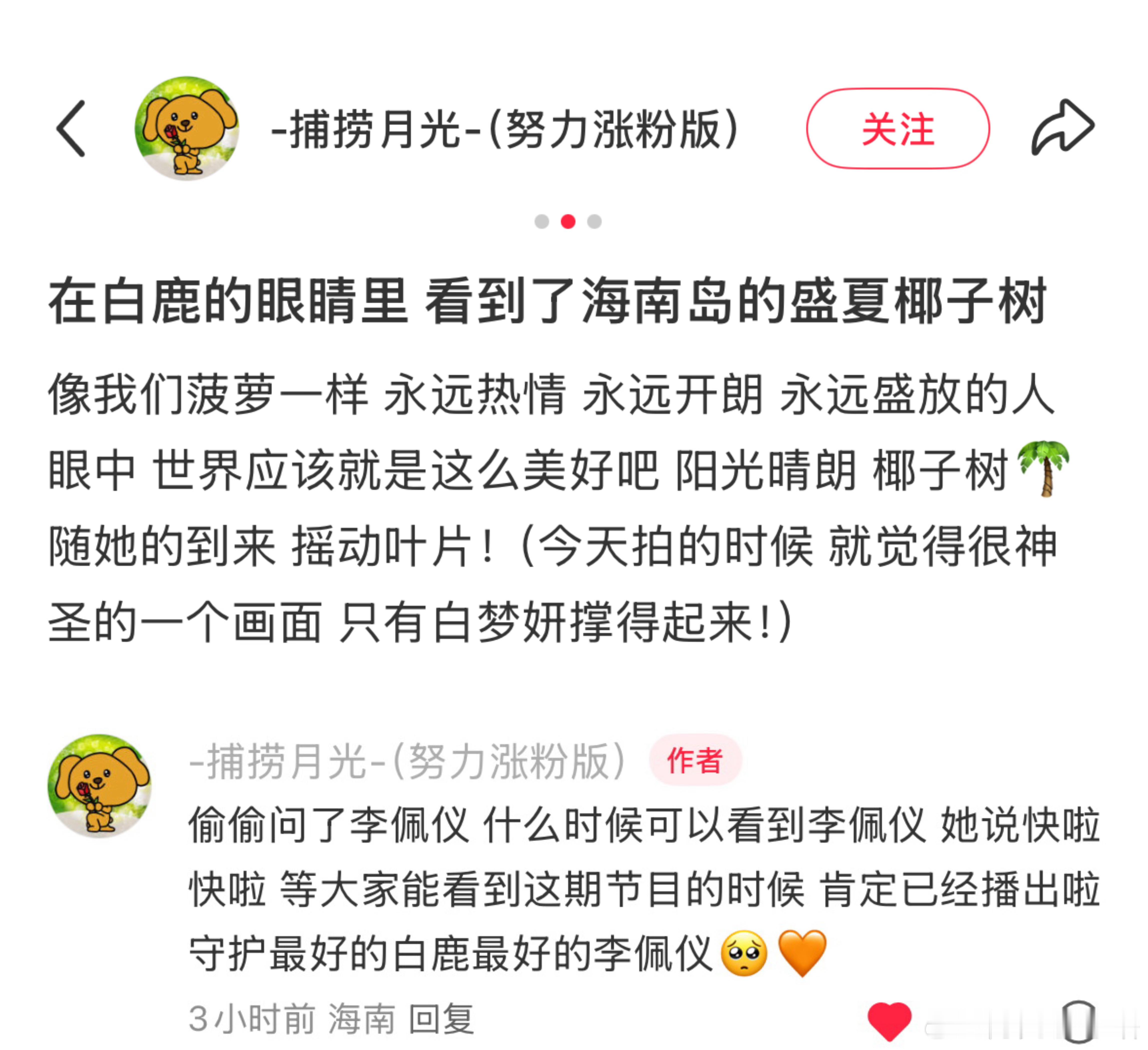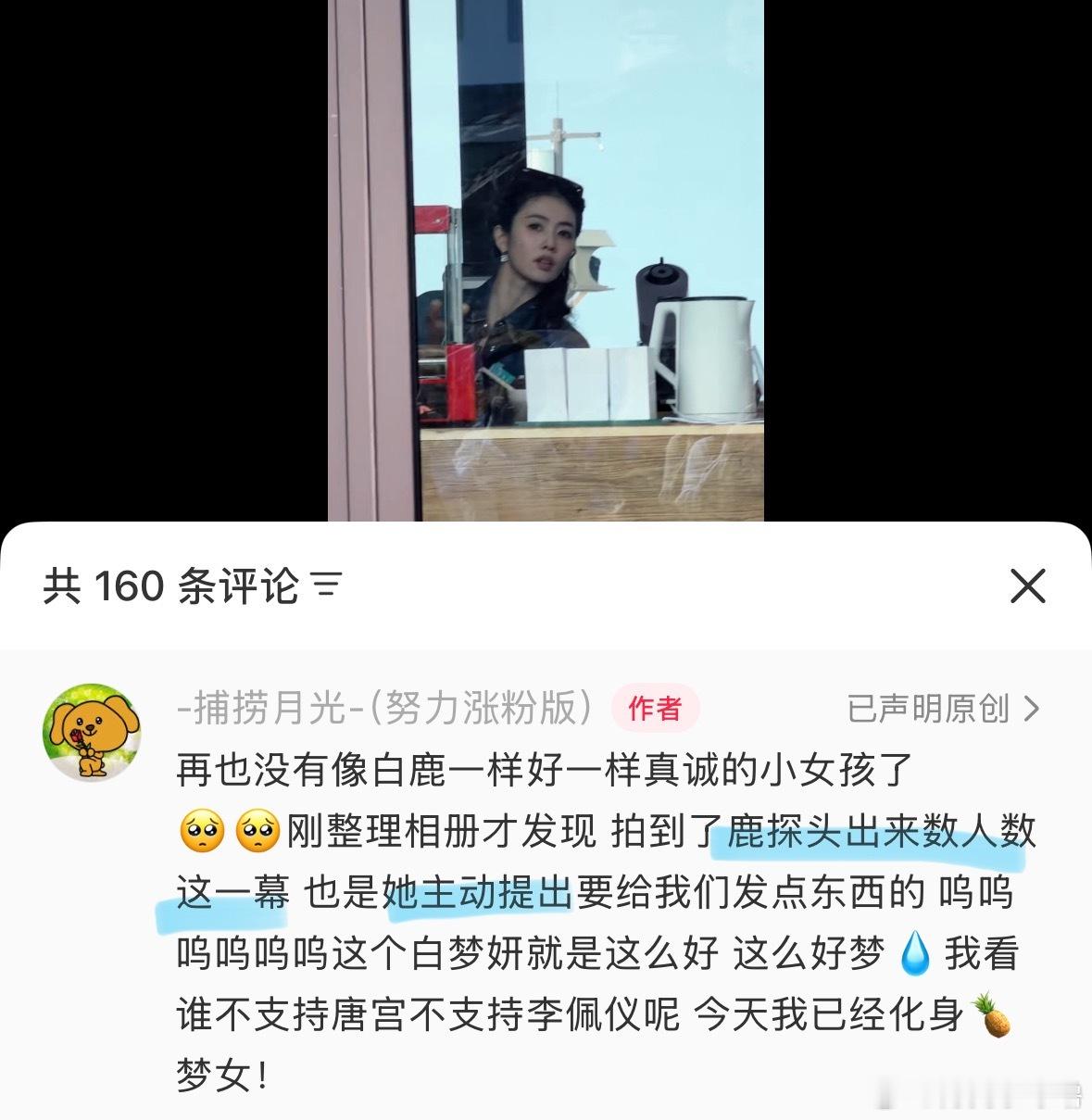 这个白鹿真的又好又真诚在🍠上看到有今天在亲爱的客栈录制现场的博主发文 “在里面探头观察外面人数 主动提出给大家分烤肠一起吃”这个鹿儿总是这样细心又大方 真的值得这满屏的夸夸 谁能不支持我们《唐宫奇案》 一起守护最好的白鹿李佩仪吧!