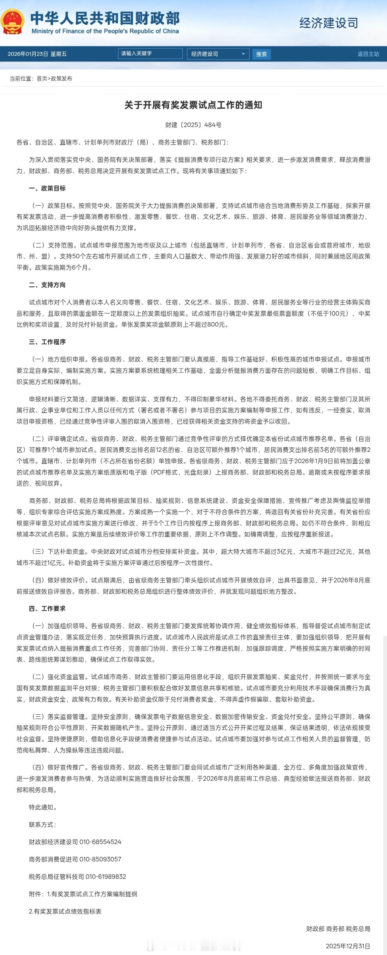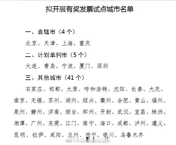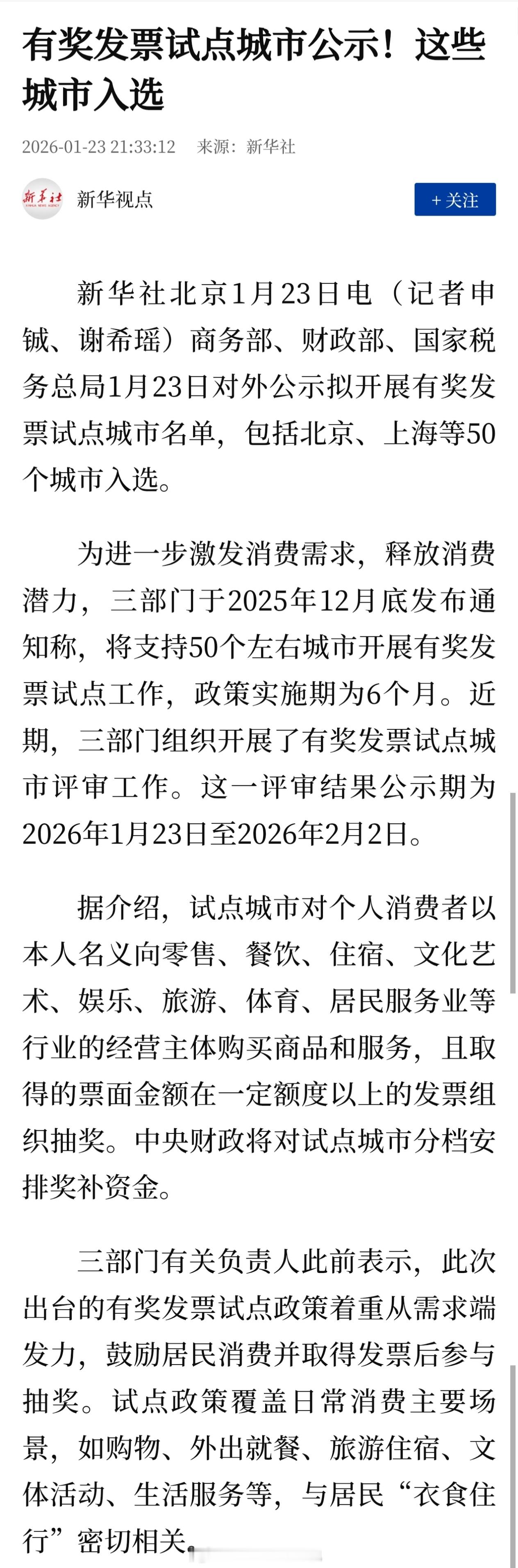 嚯!有奖发票要回来了!!!!今日商务部、财政部、国家税务总局对外公示拟开展有奖发票试点城市名单,包括北京、上海等 50 个城市入选。在稍早之前,三部门于 2025 年 12 月底发布通知称,将支持 50 个左右城市开展有奖发票试点工作,政策实施期为 6 个月。近期,三部门组织开展了有奖发票试点城市评审工作。这一评审结果公示期为 2026 年 1 月 23 日至 2026 年 2 月 2 日。试点城市对个人消费者以本人名义向零售、餐饮、住宿、文化艺术、娱乐、旅游、体育、居民服务业等行业的经营主体购买商品和服务,且取得的票面金额在一定额度以上的发票组织抽奖。中央财政将对试点城市分档安排奖补资金。拟开展有奖发票试点50城名单公布