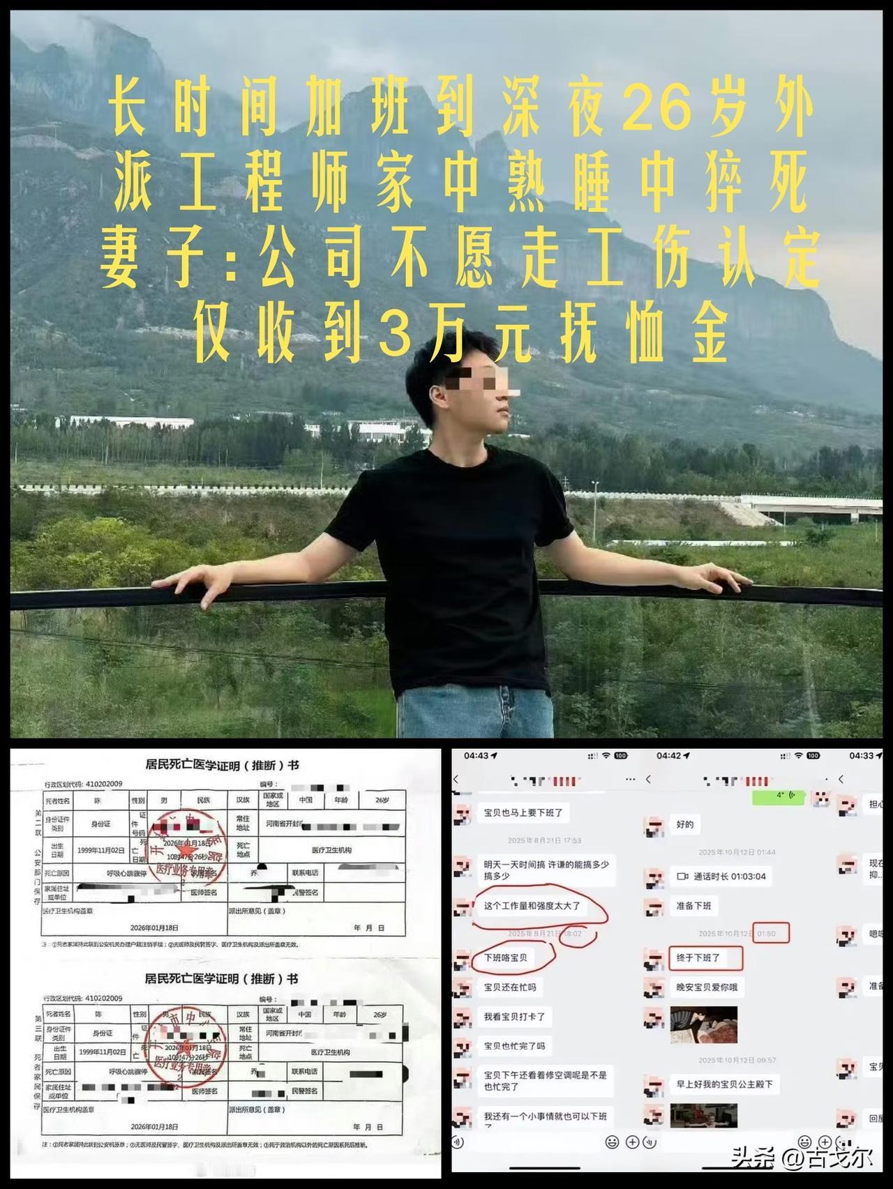 “隐形加班”真的太可怕了! 很多打工人都在经历,一旦出事儿,家庭破碎不说,维权也变得相当困难,事发在 湖北襄阳乔女士家中,2026年1月18日清晨,陈某在湖北襄阳家中熟睡时突然大叫后失去意识,送医抢救无效死亡,医院判定死因为“呼吸心搏骤停”,推测与长期劳累、压力过大相关。 死亡证明明确标注其职业为工程师,并提及熬夜史。 由于丈夫是在家中熟睡时猝死,而非工作时间、非工作岗位突发疾病,不符合工伤认定条件,故当事公司未配合工伤认定,仅提供了3万元“人道主义抚恤金”。 根据《工伤保险条例》,只有在工作时间和工作岗位突发疾病死亡或48小时内抢救无效死亡的,才视同工伤。在家中猝死通常无法认定为工伤。 妻子乔女士披露其生前长期加班至深夜,周末也要处理工作。 关于劳动关系:陈某是通过劳务派遣入职廊坊中油龙慧科技北京分公司,外派到襄阳做审计工作。 这种劳务派遣模式可能会影响责任认定。 公司在19日支付3万元抚恤金后就失联了,且明确拒绝工伤认定。乔女士公开丈夫加班记录后,公司还要求她隐藏帖子。 工程师陈某月薪约7000元(含3000底薪+补贴),是家庭唯一经济来源。现在留下50多万房贷,只剩妻子和婆婆相依为命。 若乔女士掌握有其生前存在超负荷工作、工作压力大等证据,也许还可以可尝试通过法律途径主张其用人单位承担应有的民事赔偿责任,但难度较大。律师指出家属可尝试举证“工作关联性”(如加班记录、沟通截图),但劳务关系复杂致维权困难。 舆论呼吁法律明确“隐形加班”工伤认定标准,强化对劳务派遣监管,建议各企业修订“非工作时间通讯规则”,提倡“拒绝拿命换钱”。也给大家提了个醒,钱是挣不完的,工作丢了可以再找,活着比什么都重要,大家觉得呢?