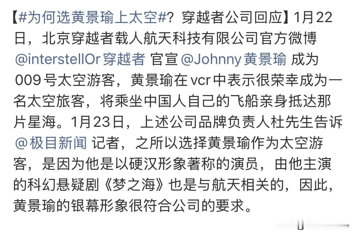 1月23日,黄景瑜搭乘飞船上太空的这家公司也太不靠谱了!23年才成立,老板是一名94年主持专业的女生,公司4项专利,其中3项授权,1项审查,老板还都是第一发明人,她专业跟航空都不搭架,怎么发明的专利? 再看她展示的飞船,窗户都是画的,这不是很扯么?听她说选择黄景瑜上太空的原因,是黄景瑜荧幕形象比较符合她们公司的要求,这不就是草台班子,拿黄景瑜做噱头么? 这真的靠谱么?这可不比飞机成熟度高,这上去容易,下来可就难了!