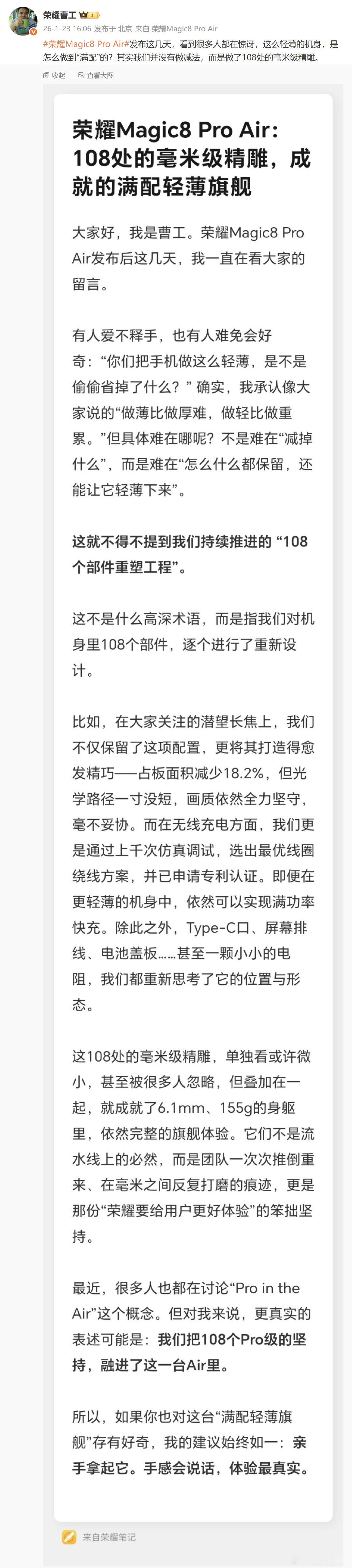 荣耀工程师称做Air不代表阉割配置 荣耀Magic8 Pro Air 我已经作为主力机用了一段时间了,真的爱不释手,轻薄体验非常好。荣耀没有选择行业常见的轻薄即阉割的路线,而是挑战了更高难度的满配重构路线,很难得,让这台手机没有明显短板。108处毫米级精雕,处处是成本,也处处是诚意。荣耀Magic8 Pro Air
